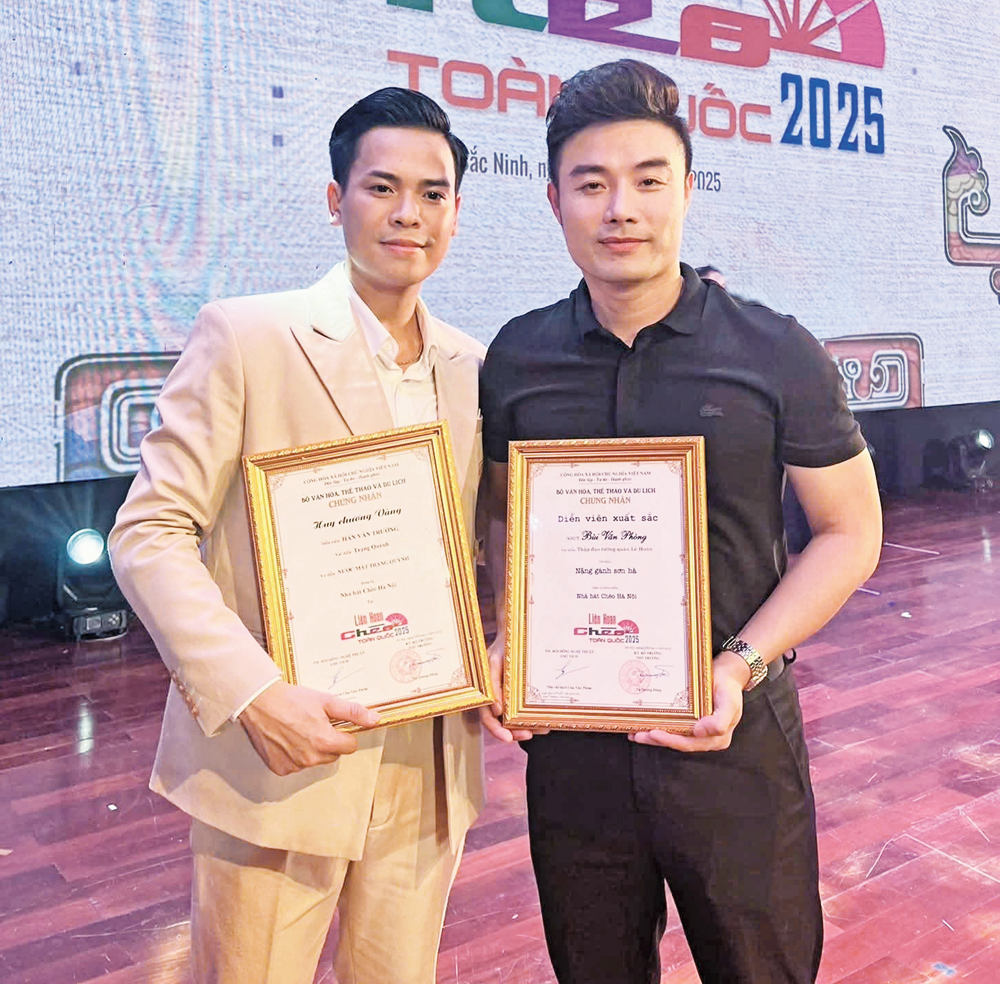 Nghệ sĩ Ưu tú Quốc Phòng (bên phải) cùng đồng nghiệp tại lễ bế mạc và trao giải.