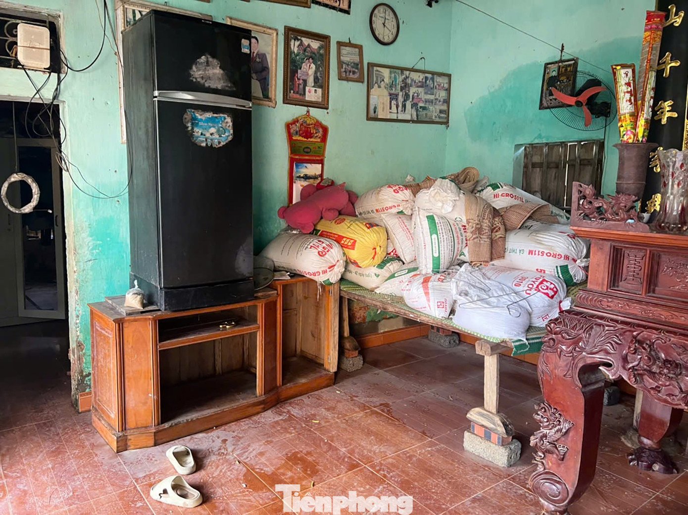 Người dân kê giường, bàn ghế lên cao. Cả gia đình sinh hoạt trong điều kiện tạm bợ.