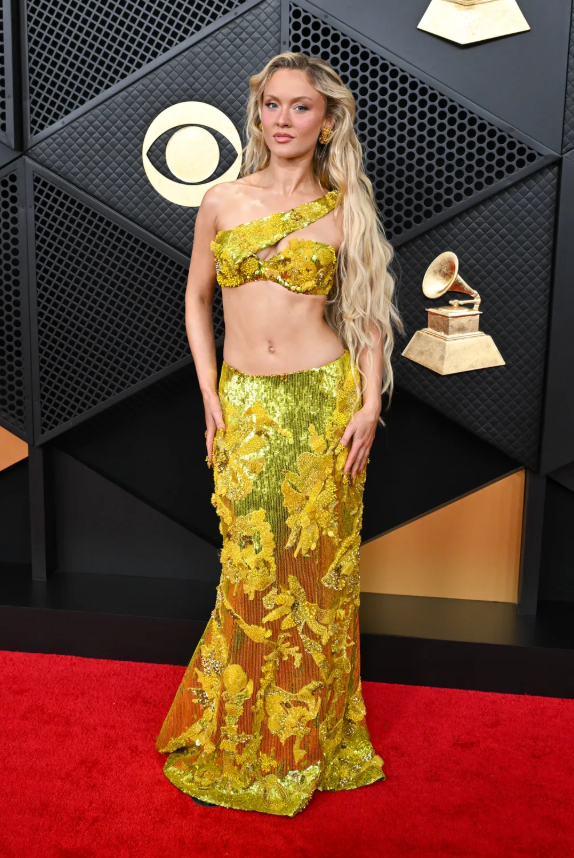 Sabrina Carpenter chọn một bộ trang phục thanh thoát với nhiều lớp vải tuyn xếp nếp và tay áo buông xuống vai như một chiếc khăn choàng đính sequin mỏng manh. Ảnh: Who What Wear