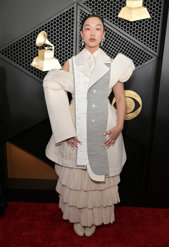 Là một trong ba nhân vật chính trong bộ phim K-Pop Demon Hunters , Audrey Nuna không hề xa lạ với phong cách táo bạo. Cô chọn một thiết kế độc đáo của Thom Browne với chân váy xếp tầng và áo khoác ngoại cỡ kết hợp nhiều chất liệu đầy tính nghệ thuật. Ảnh: Harpers Bazaar