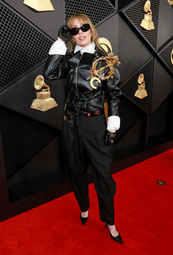 Miley Cyrus diện một bộ trang phục Celine được thiết kế riêng với áo khoác da và một chiếc trâm cài trang trí cầu kỳ, lộng lẫy. Ảnh: Who What Wear