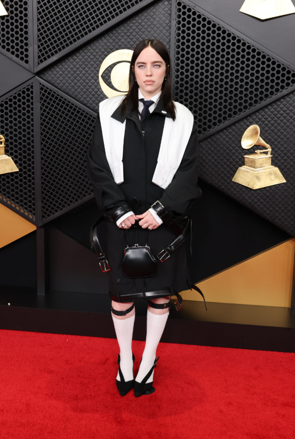 Bộ trang phục đặt may riêng của Billie Eilish từ Hodakova đã tái hiện lại phong cách may đo truyền thống thông qua kỹ thuật tháo rời các chi tiết. Áo khoác được ghép từ quần tây len màu xanh navy và áo sơ mi trắng, trong khi chân váy cũng được tạo hình tương tự từ quần tây, một cách tiếp cận sáng tạo và phá cách đối với trang phục thảm đỏ. Ảnh: Harpers Bazaar