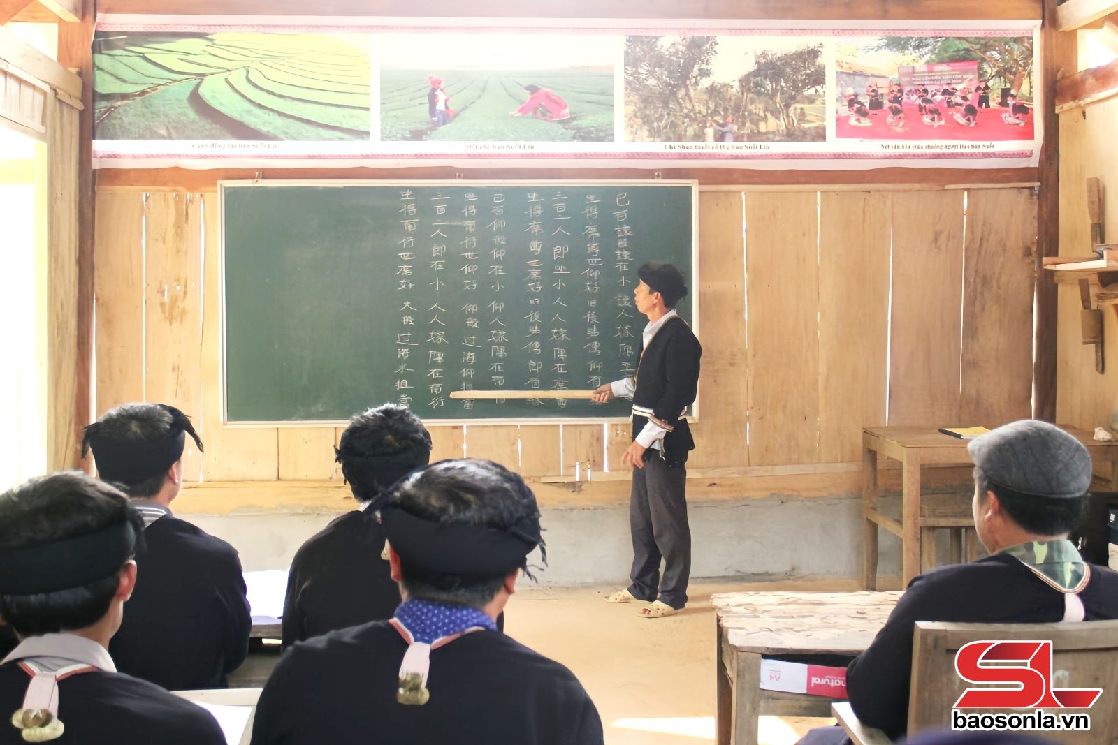 Nghệ nhân ưu tú Bàn Văn Đức dạy chữ Nôm Dao.