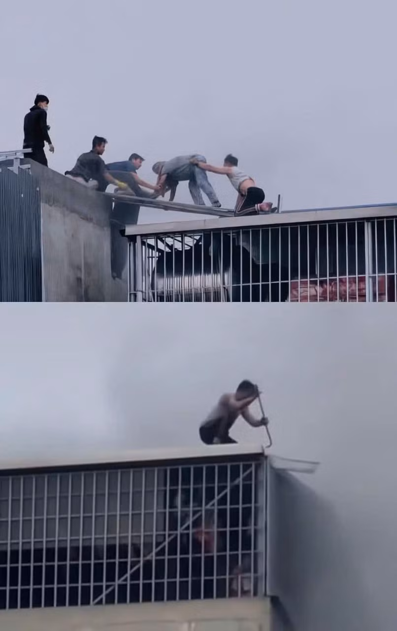 Tiếp cận được tầng tum, trước mắt họ là lớp mái tôn và hệ thống cửa sắt quây kín. Trong làn khói dày đặc, hai người đàn ông dùng thanh sắt hộp phá mái tôn, vừa để thoát khói, vừa mở đường sống cho những người bên trong. Thời điểm đó, lửa và khói cuồn cuộn bốc lên, còn họ đứng cheo leo ở độ cao hàng chục mét, nơi chỉ một sai sót nhỏ cũng có thể phải trả giá bằng tính mạng.