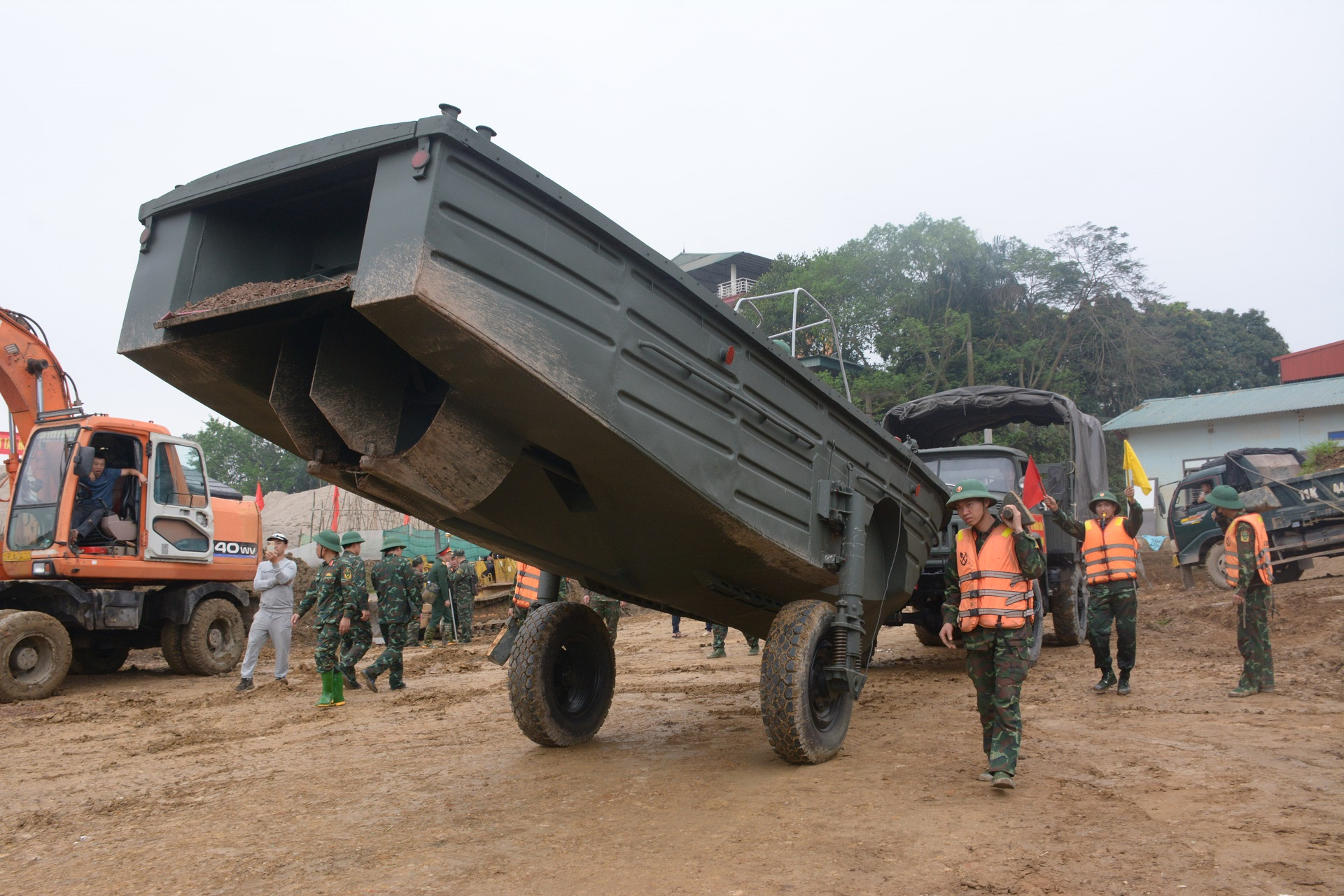 Xe chở đốt cầu phao di chuyển xuống bến để hạ thủy.