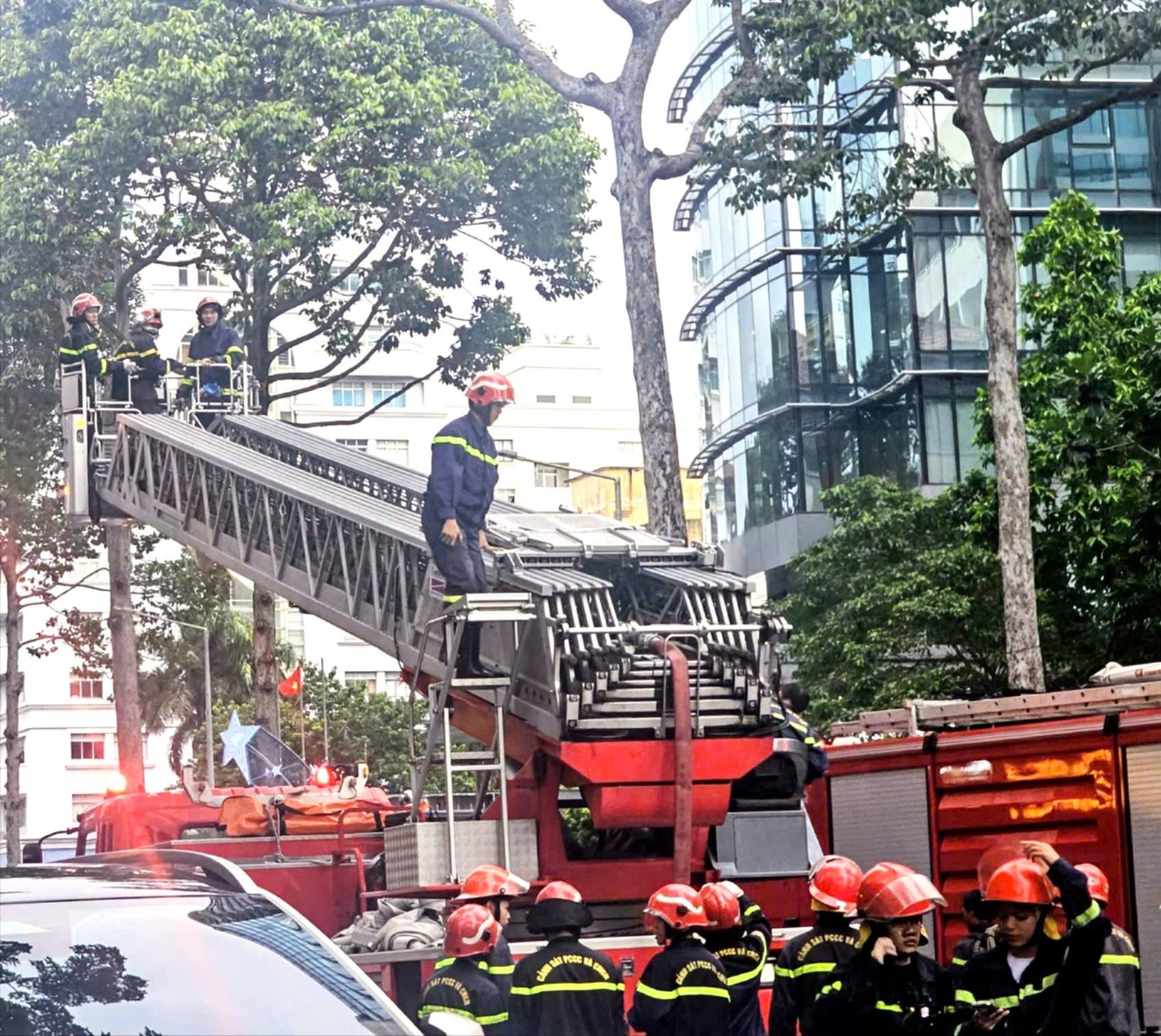 Cán bộ, chiến sĩ PCCC - CNCH trên xe thang tiếp cận hiện trường vụ cháy tại phường Cầu Ông Lãnh, TPHCM. Ảnh: THU HOÀI