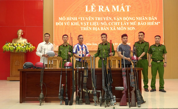 Công an xã Môn Sơn ra mắt mô hình đổi vũ khí, vật liệu nổ lấy mũ bảo hiểm.