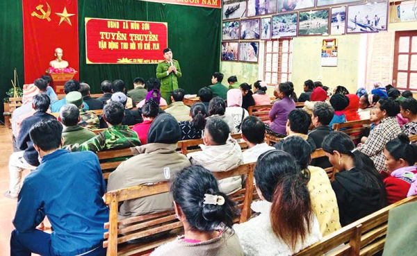 Bằng phương pháp tuyên truyền cá biệt, phân tích, phổ biến các quy định mới của pháp luật để bà con chủ động giao nộp các công cụ, phương tiện đánh bắt thú rừng. Trong 2 ngày 26 và 27/3, Công an xã đã vận động 3 người dân tại bản Xằng và một người dân tại bản Trung Thành giao nộp 4 khẩu súng kíp, 1 khẩu súng PCP và 1 bộ kích điện, nhiều bộ bẫy thú rừng. Để nâng cao hiệu quả của việc vận động, thu hồi vũ khí, vật liệu nổ trên địa bàn, ngày 19/3/2026, Công an xã Môn Sơn đã ra mắt mô hình “Vận động nhân dân giao nộp vũ khí, vật liệu nổ, công cụ hỗ trợ và pháo đổi mũ bảo hiểm”.