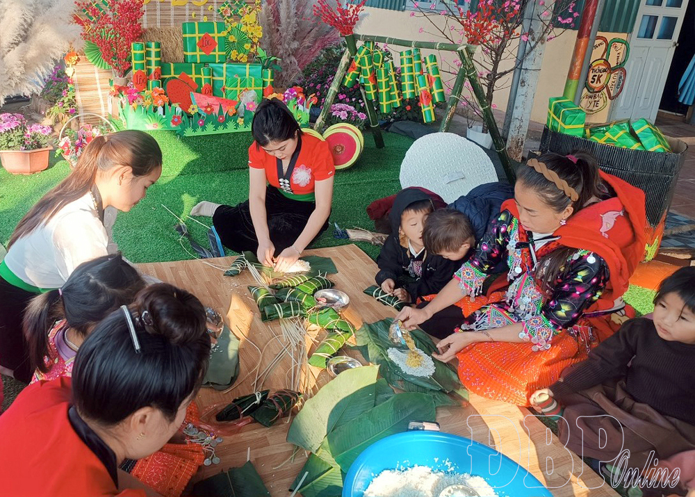 Cô và trò Trường Mầm non Nà Bủng quây quần gói bánh chưng chuẩn bị đón tết.