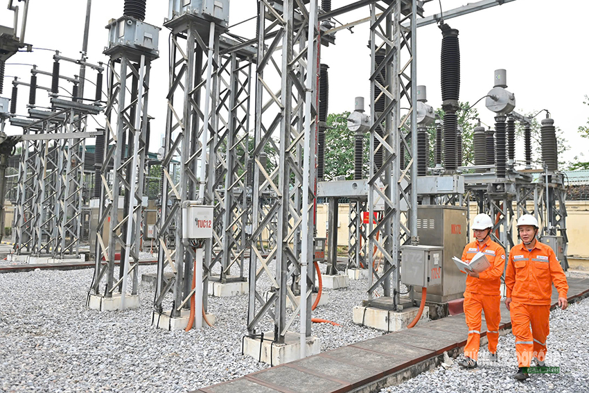 Công nhân điện lực kiểm tra, rà soát đường dây và thiết bị ngoài hiện trường, đảm bảo an toàn lưới điện tại khu vực phụ tải trọng điểm phục vụ Đại hội XIV của Đảng.