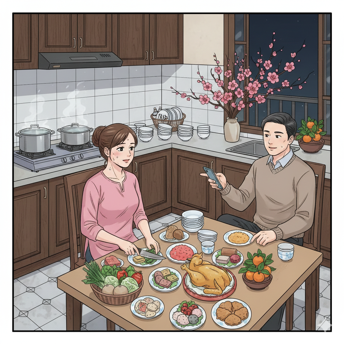 Đứng trong bếp lúc 11 giờ đêm với những giọt nước mắt lã chã, chị tự hỏi tại sao cái hủ tục ấy lại hành hạ phụ nữ đến mức này. Suốt từ mùng 1 đến mùng 4 là một vòng lặp ác mộng: Hết cúng bái lại đến tiếp khách cho chồng sĩ diện với bạn bè. Trong khi chồng vỗ ngực hào phóng rủ bạn nhậu nhẹt, vợ lại lủi thủi dưới xó bếp làm mồi, dọn bãi nôn và rửa bát chén.