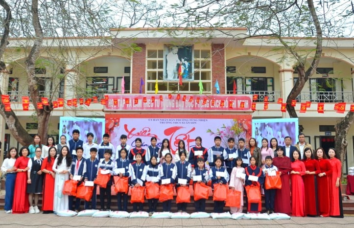 Trường THCS Xuân Sơn tặng quà Tết cho học sinh có hoàn cảnh khó khăn. Ảnh: Hương Chung