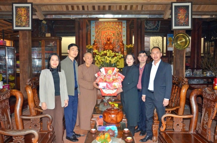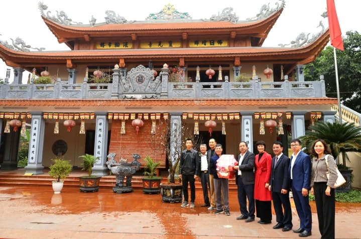 Lãnh đạo phường Tùng Thiện thăm và tặng quà chúc Tết chùa Cúc. Ảnh: Huyền Giang