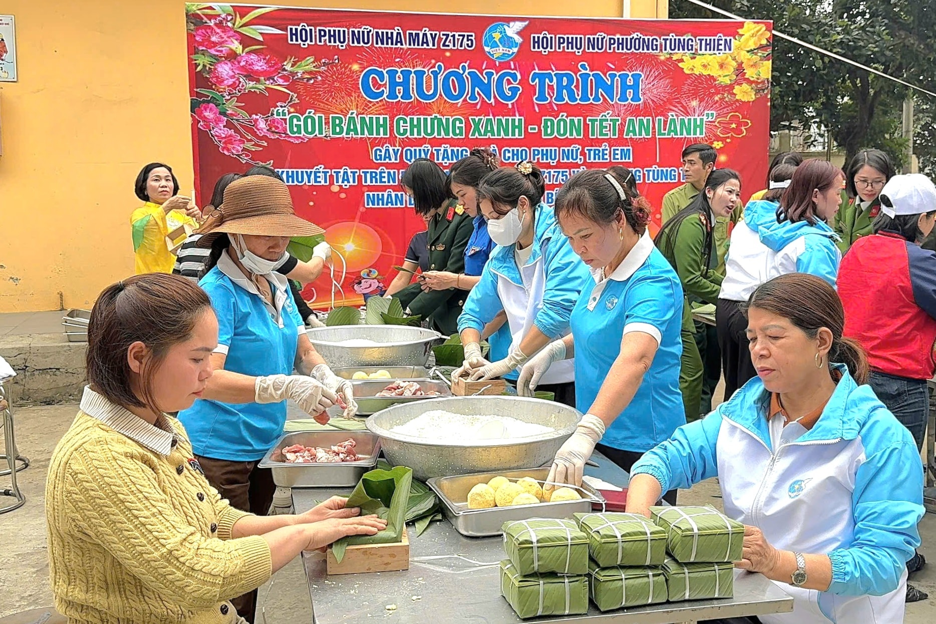 Giữa những gian hàng Hội chợ xuân rộn ràng và tiếng reo hò cổ vũ của cuộc thi kéo co, là sự gắn kết keo sơn giữa đơn vị quân đội và chính quyền địa phương. Hội Liên hiệp phụ nữ phường Tùng Thiện đã cùng Hội Liên hiệp phụ nữ Nhà máy Z175 chung tay trong hoạt động “Gói bánh chưng xanh - Đón Tết an lành”.