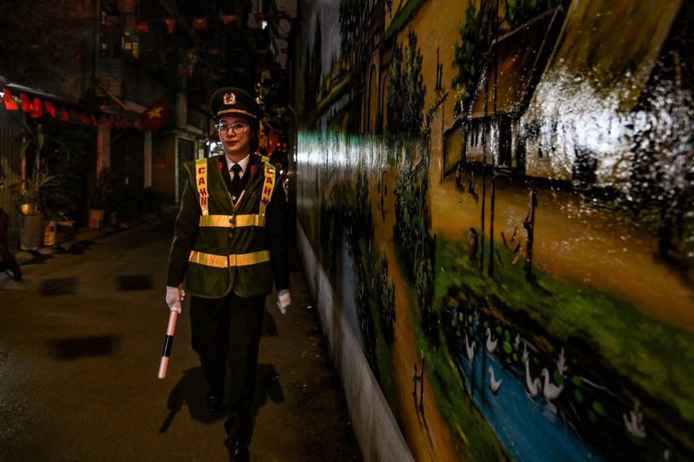 Các nữ chiến sĩ Công an có mặt ở nhiều ngõ nhỏ, bất kể đêm khuya, cả khi thời tiết chìm trong giá rét 10 độ C, vẫn quyết tâm bảo vệ an ninh, an toàn trong những ngày diễn ra Đại hội