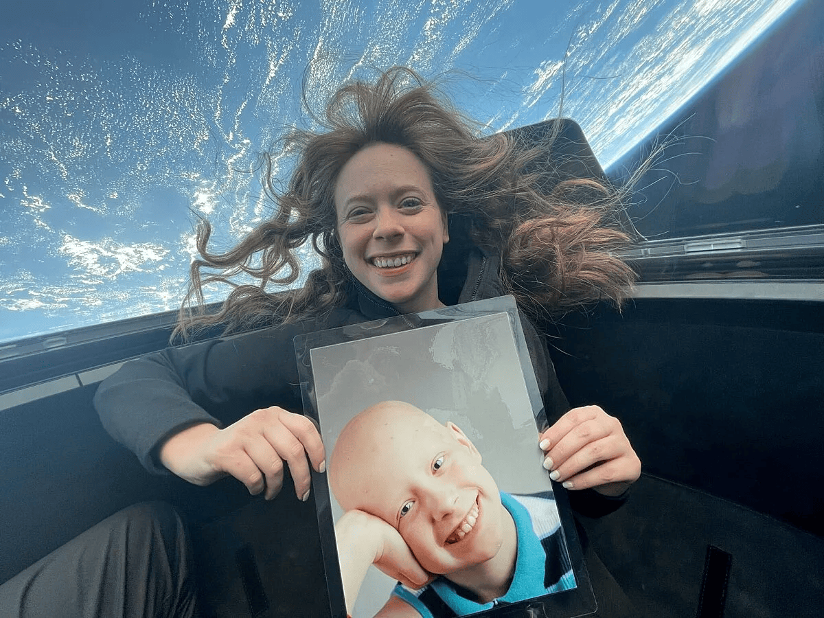 Hayley Arceneaux tươi cười cùng bức ảnh khi cô còn điều trị ung thư xương trên vũ trụ. Ảnh: Hayley Arceneaux