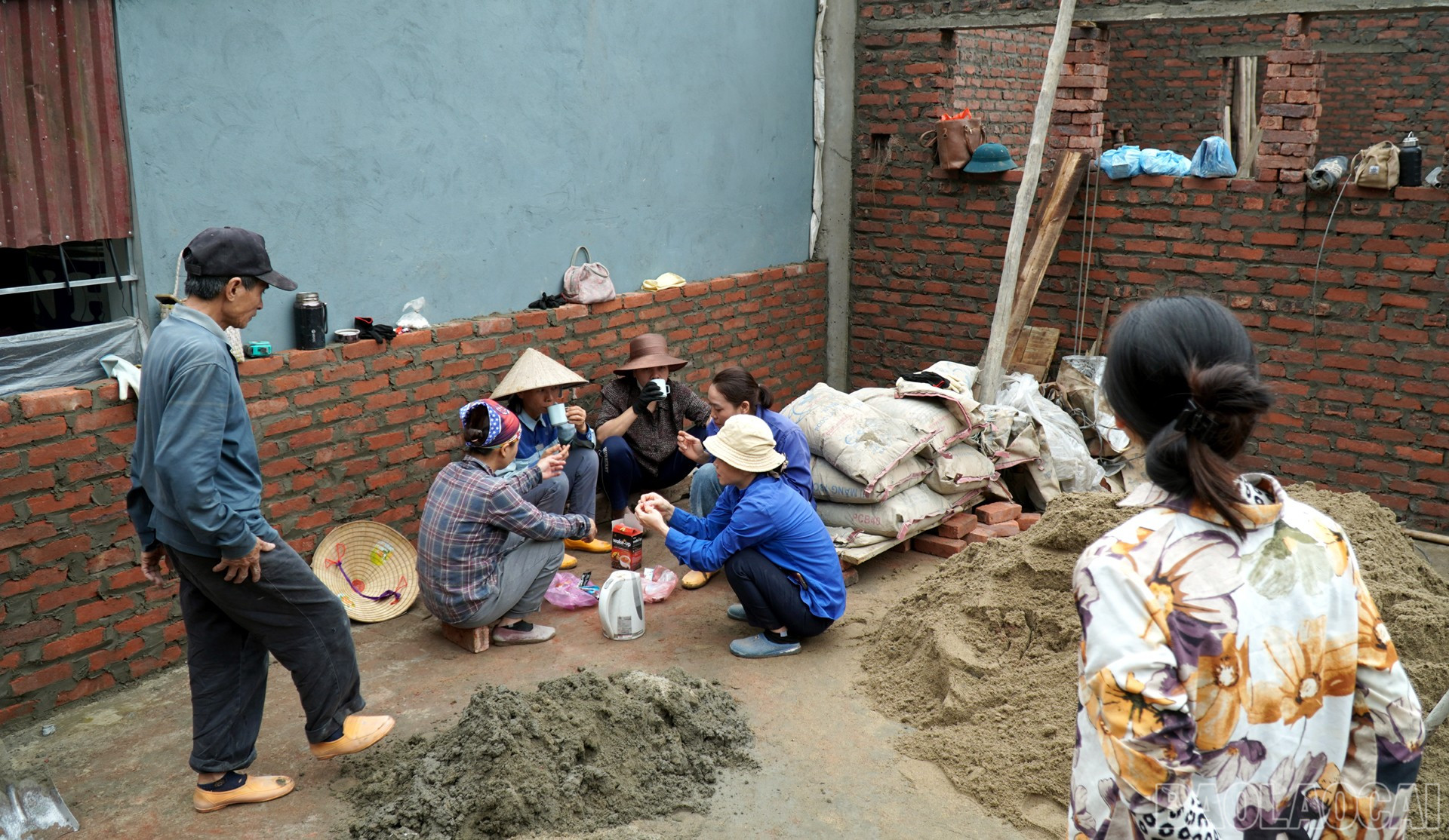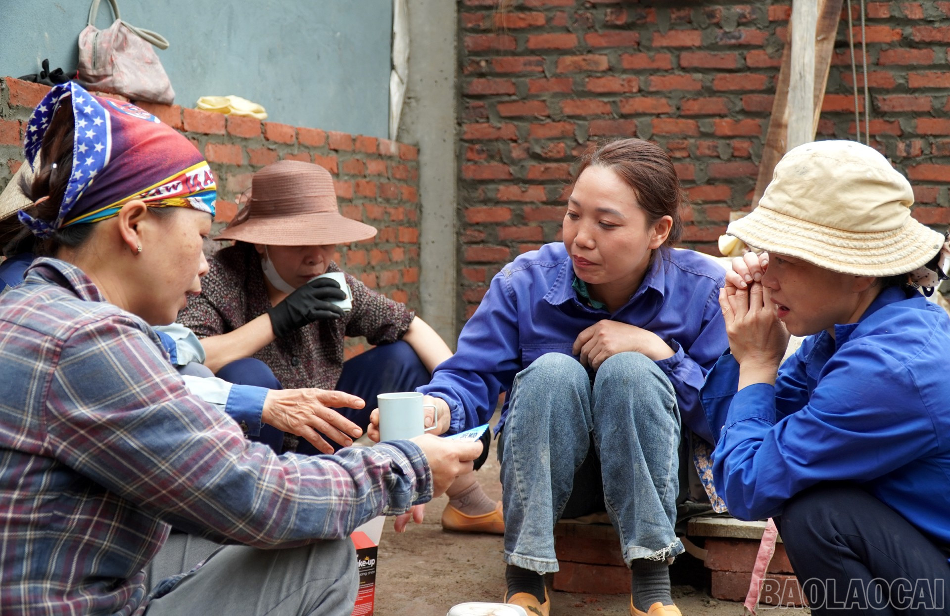 Trong những phút nghỉ ngắn bên gạch vữa, chị em chia sẻ câu chuyện đời thường để vơi bớt nỗi nhọc nhằn của nghề.
