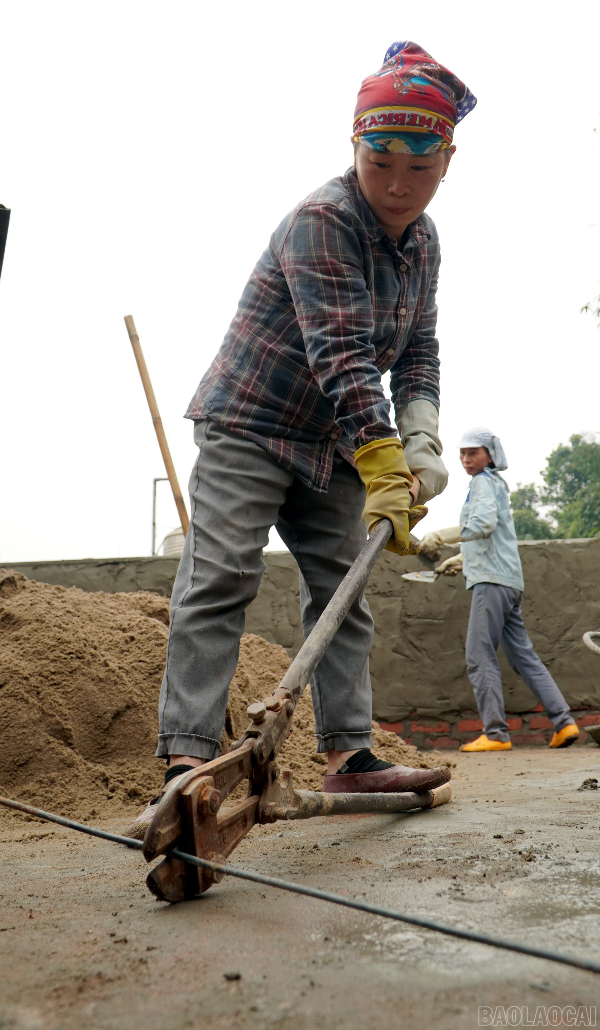 Kỹ thuật trát tường điêu luyện của nữ thợ nề không hề thua kém các đồng nghiệp nam.
