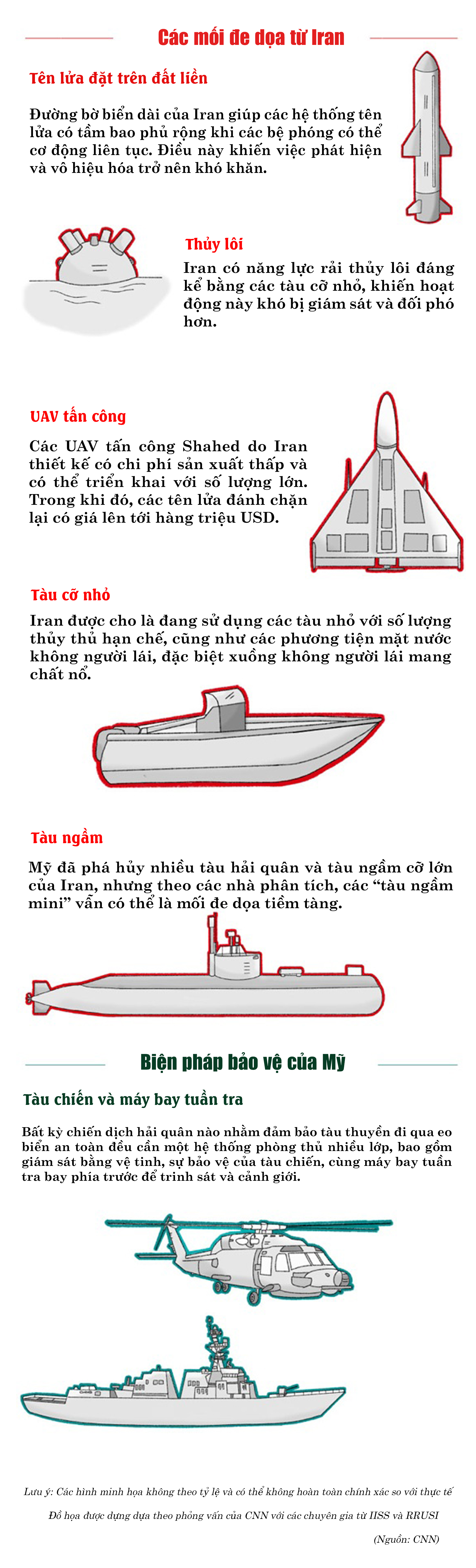 Dưới đây là ảnh đồ họa về những mối đe dọa mà các tàu dân sự phải đối mặt tại Eo biển Hormuz.