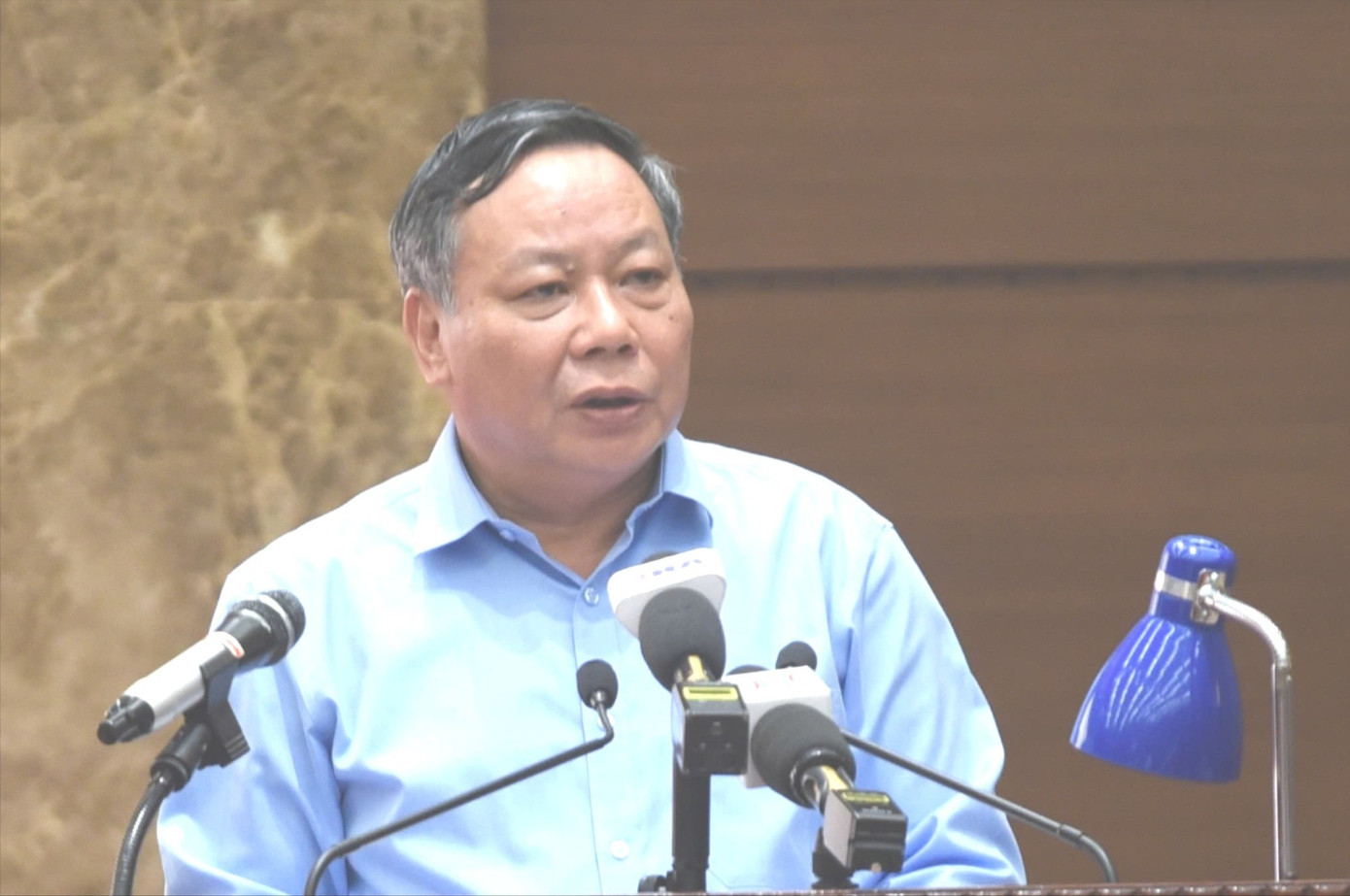 Phó Bí thư Thường trực Thành ủy Hà Nội Nguyễn Văn Phong trao đổi tại họp báo. Ảnh: Thành An.
