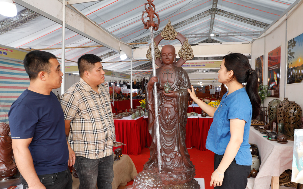 Tác phẩm gốm Địa Tạng Vương Bồ Tát (cao 1,7m), sản xuất năm 2026 của Hợp tác xã Phù Lãng, xã Phù Lãng có giá trị nghệ thuật cao.