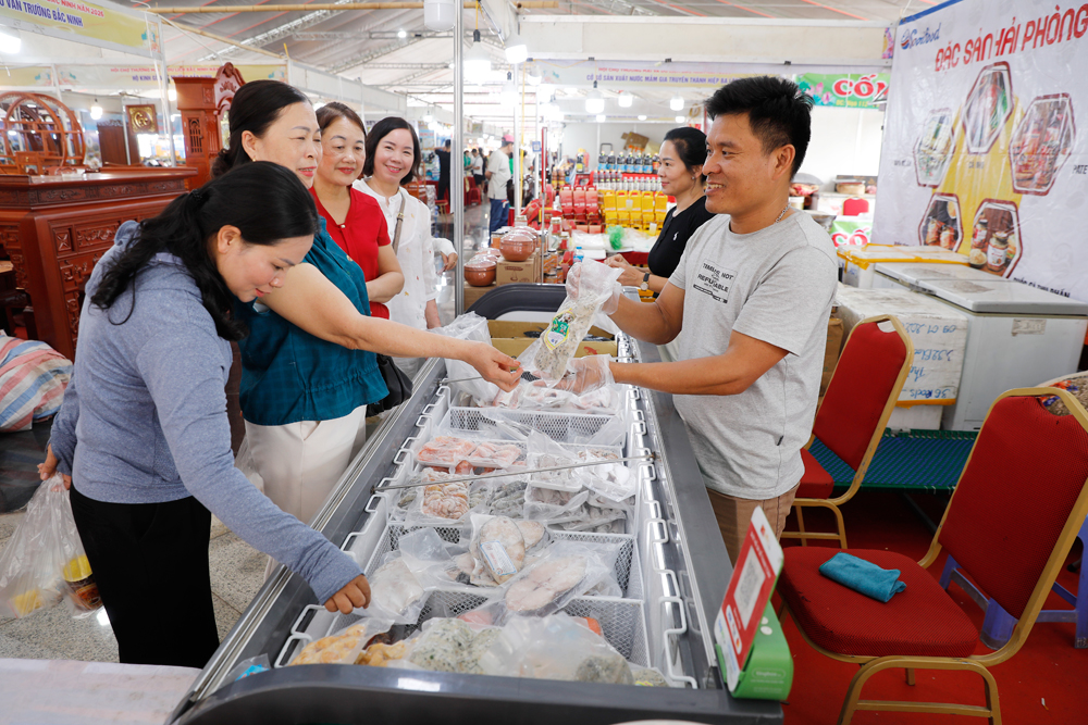 Hội chợ còn có sự tham gia của nhiều thành phố, tỉnh bạn với hàng trăm loại đặc sản, sản phẩm vùng miền cao cấp. Ảnh: Người dân mua hải sản chế biến tại gian trưng bày sản phẩm OCCP của Thành phố Hải Phòng.