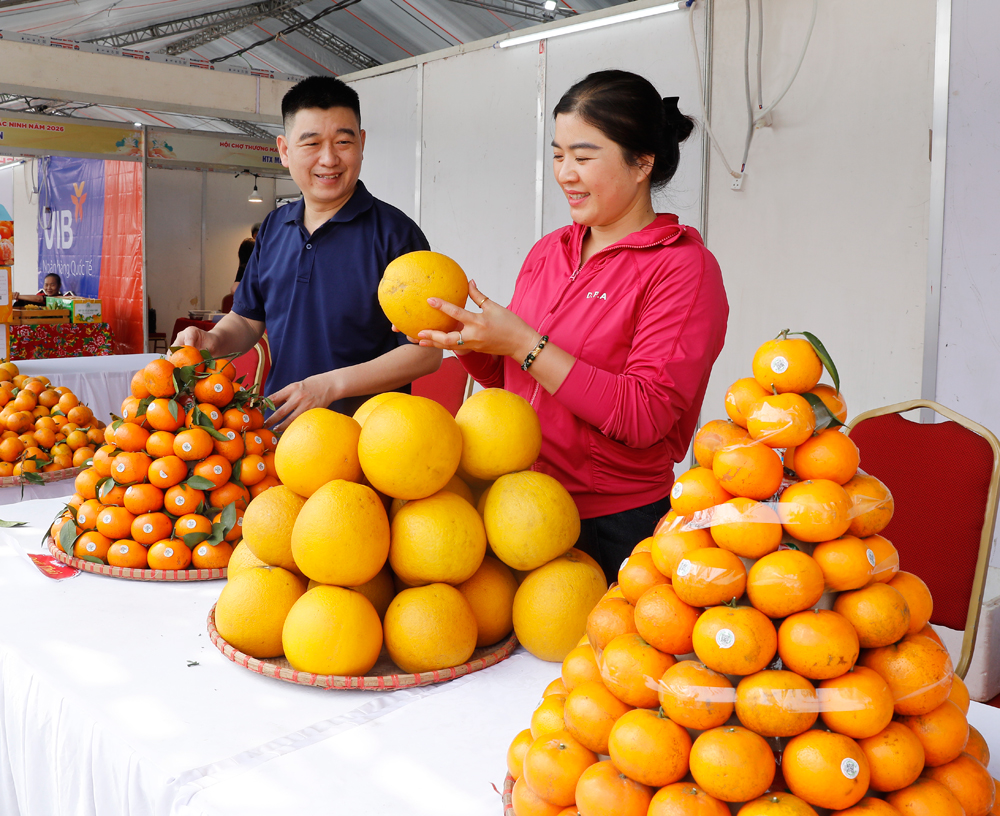 Cùng với sản phẩm thủ công mỹ nghệ, các địa phương, doanh nghiệp, hợp tác xã còn mang đến hội chợ nhiều nông sản, nông sản chế biến, sản phẩm OCOP nổi tiếng. Ảnh: Sản phẩm cam, bưởi của phường Chũ.