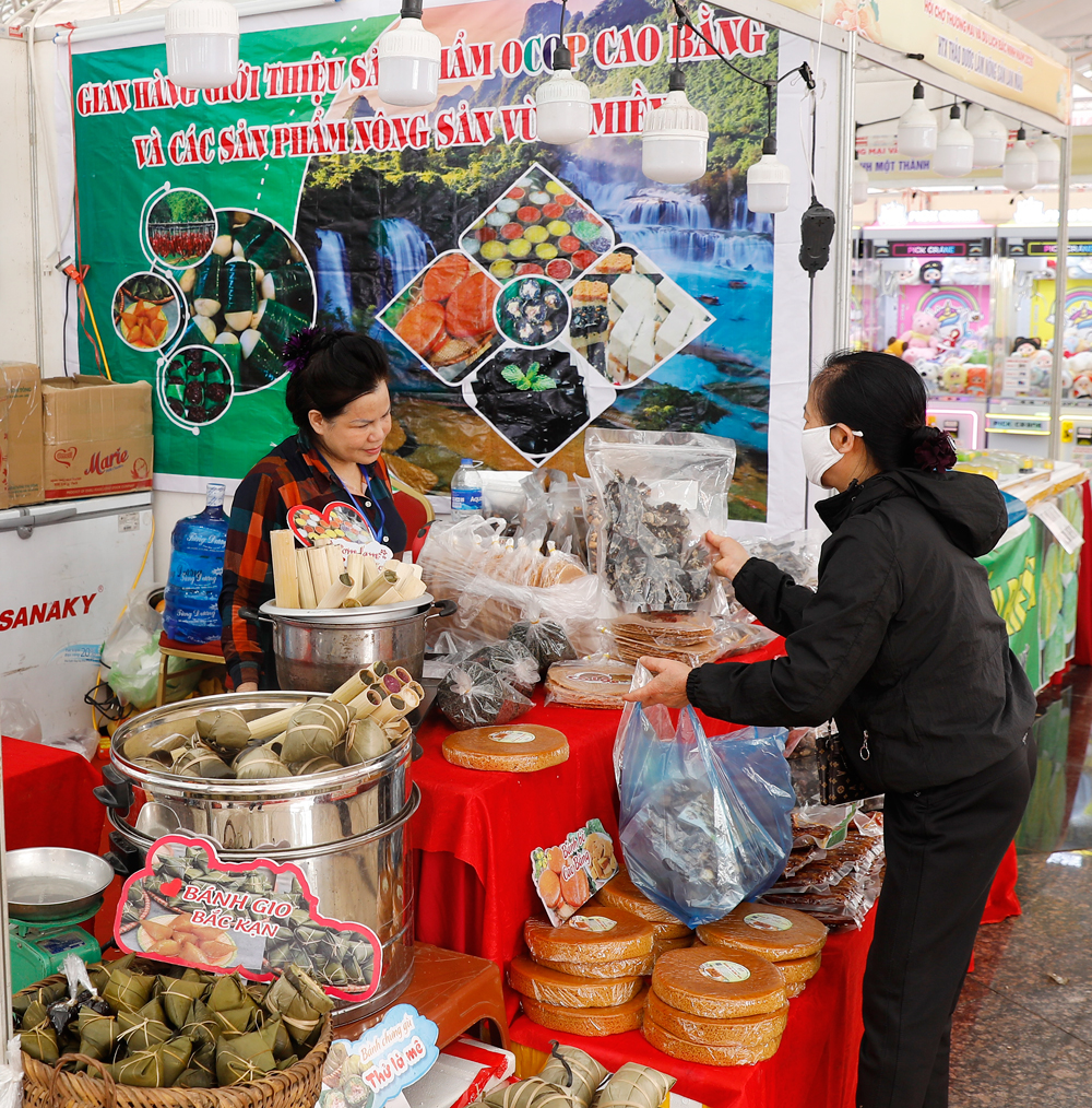 Khách mua các sản phẩm bánh chế biến từ gạo của tỉnh Cao Bằng.