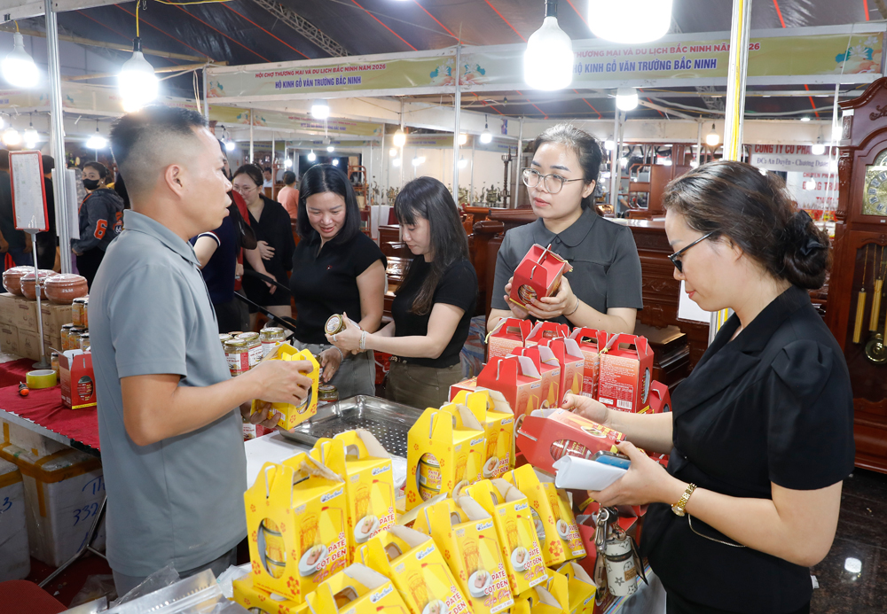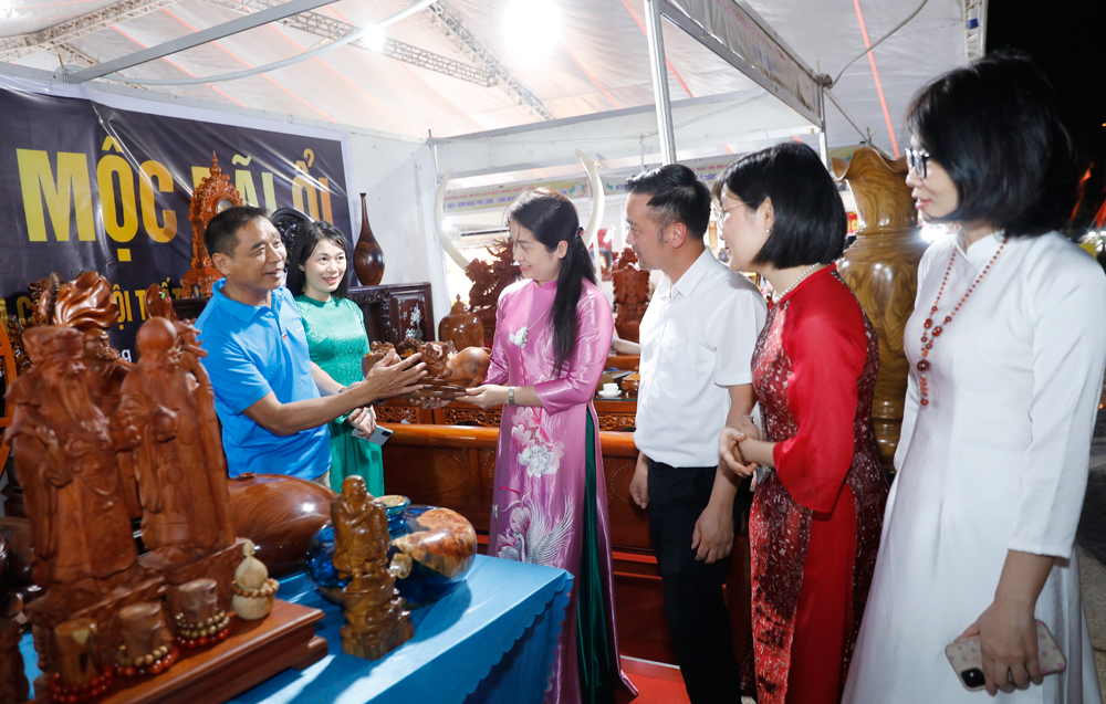 Đêm khai mạc, hội chợ đã thu hút hàng nghìn người dân đến tham quan, mua sắm. Ảnh: Đồng chí Phạm Văn Thịnh, Ủy viên Ban Thường vụ Tỉnh ủy, Phó Chủ tịch UBND tỉnh cùng các đại biểu thăm gian trưng bày sản phẩm bon sai nghệ thuật làm bằng dây đồng của hộ kinh doanh Lê Xuân Thường, tổ dân phố Nội Trung, phường Trạm Lộ.