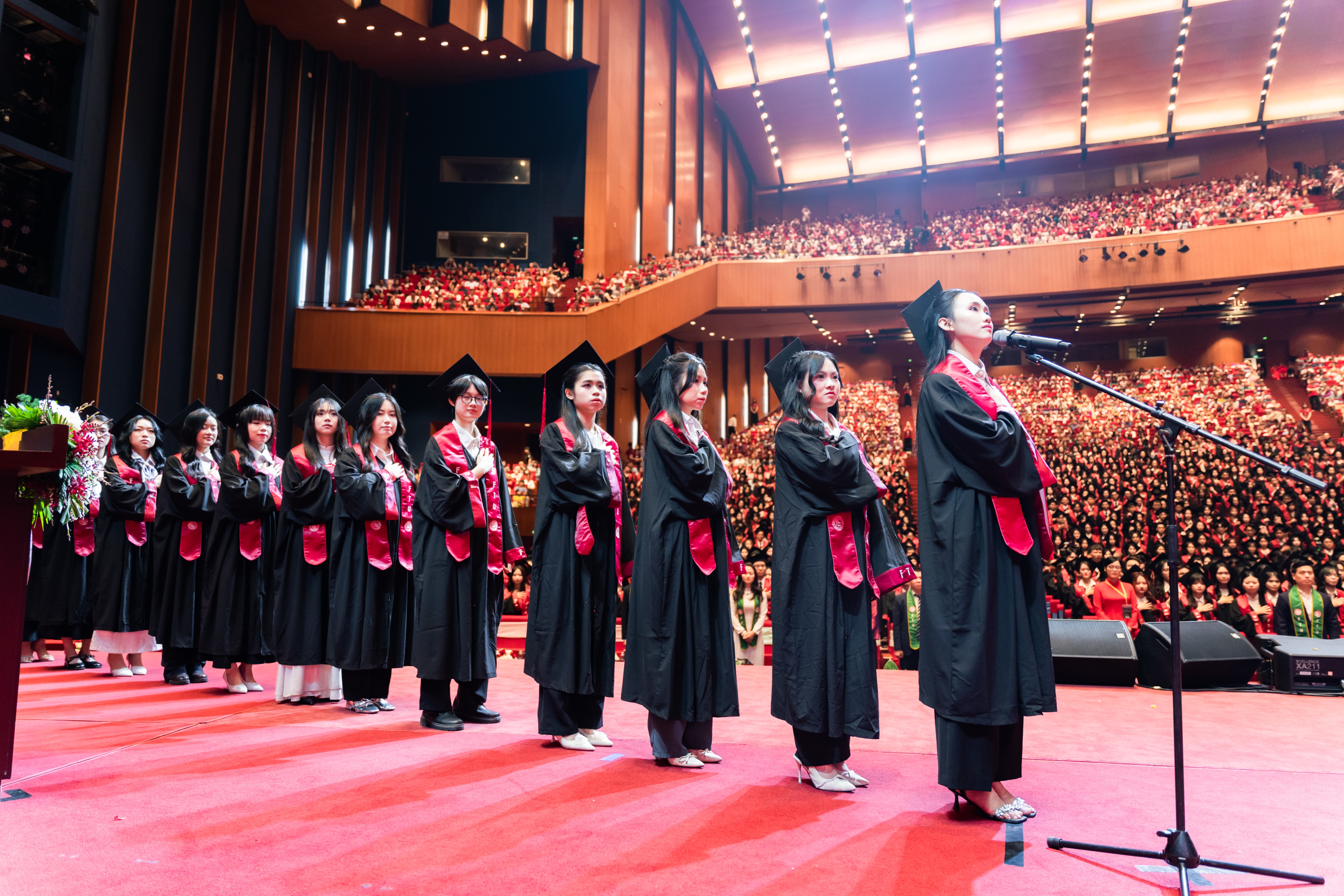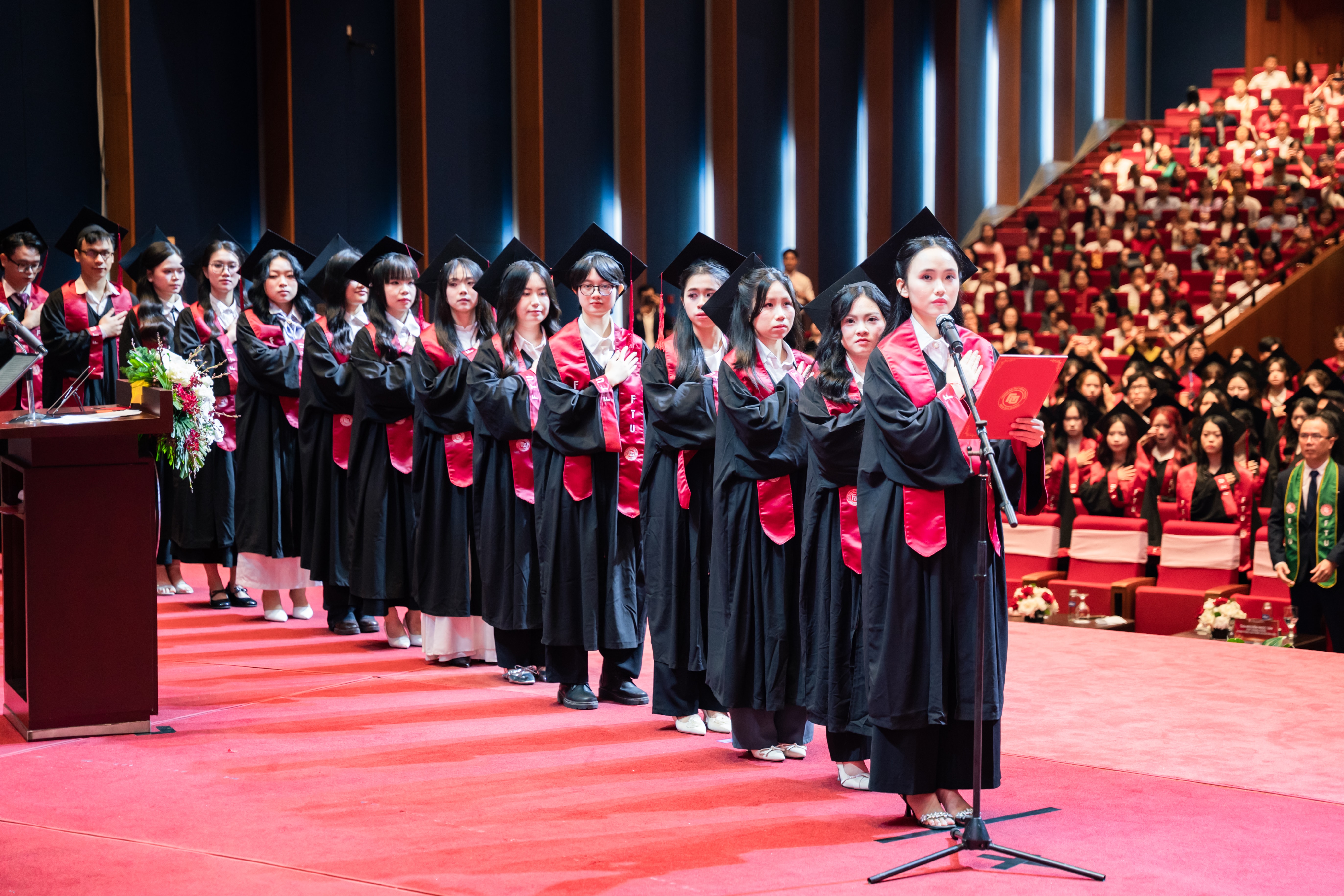 Đại diện sinh viên tiêu biểu tốt nghiệp đợt này cùng các tân cử nhân thực hiện nghi lễ tuyên thệ.