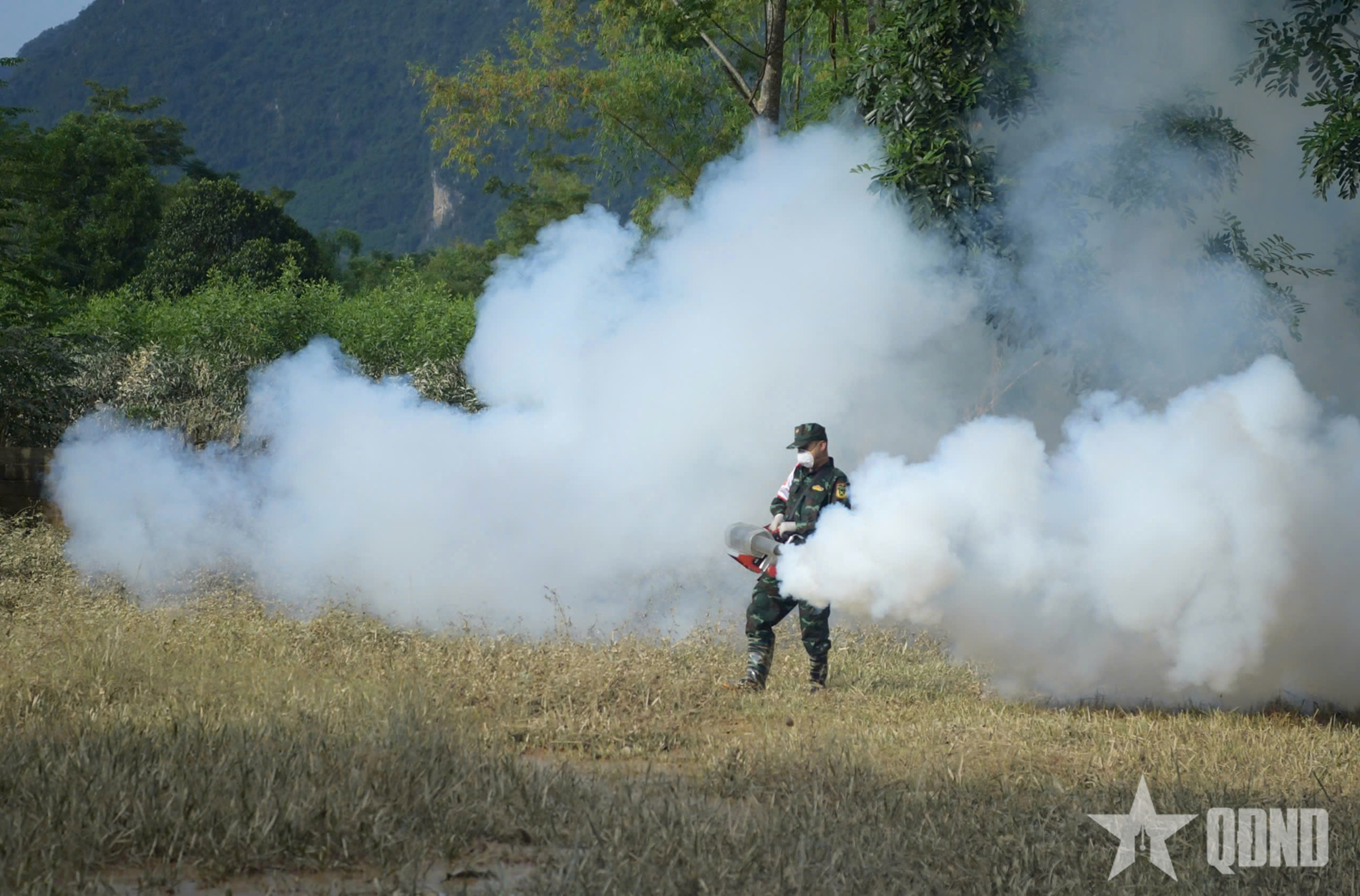 Cán bộ Viện Y tế dự phòng Quân đội phun khử khuẩn sau lũ tại các điểm ngập úng trên địa bàn tỉnh Lạng Sơn.