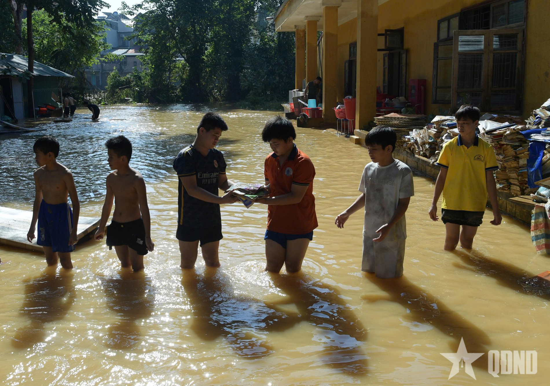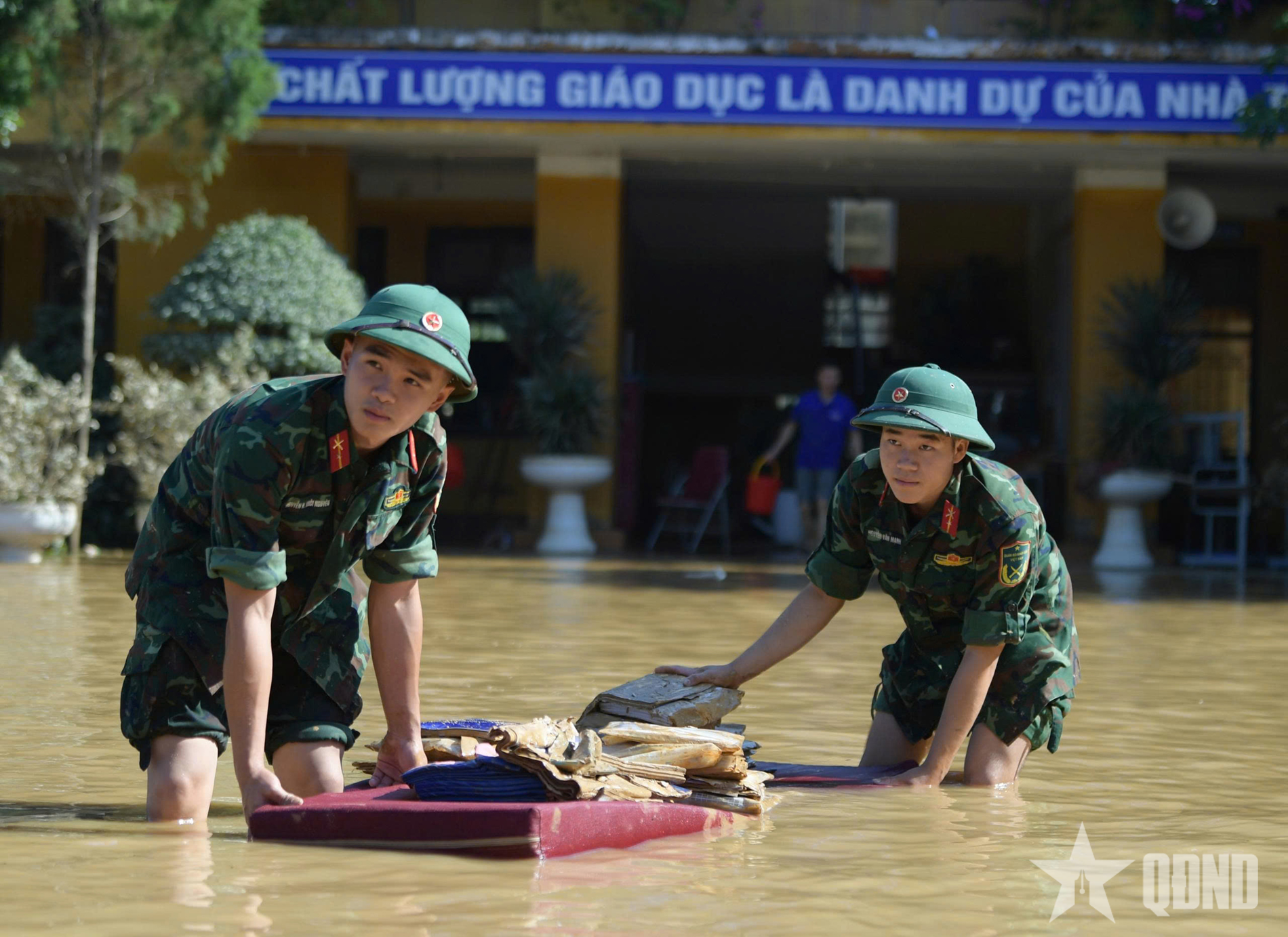 Chiến sĩ Trung đoàn 12 (Sư đoàn Bộ binh 3, Quân khu 1) giúp học sinh Trường Phổ thông Dân tộc Nội trú Hữu Lũng (Lạng Sơn) thu gom sách vở bị nước lũ nhấn chìm.
