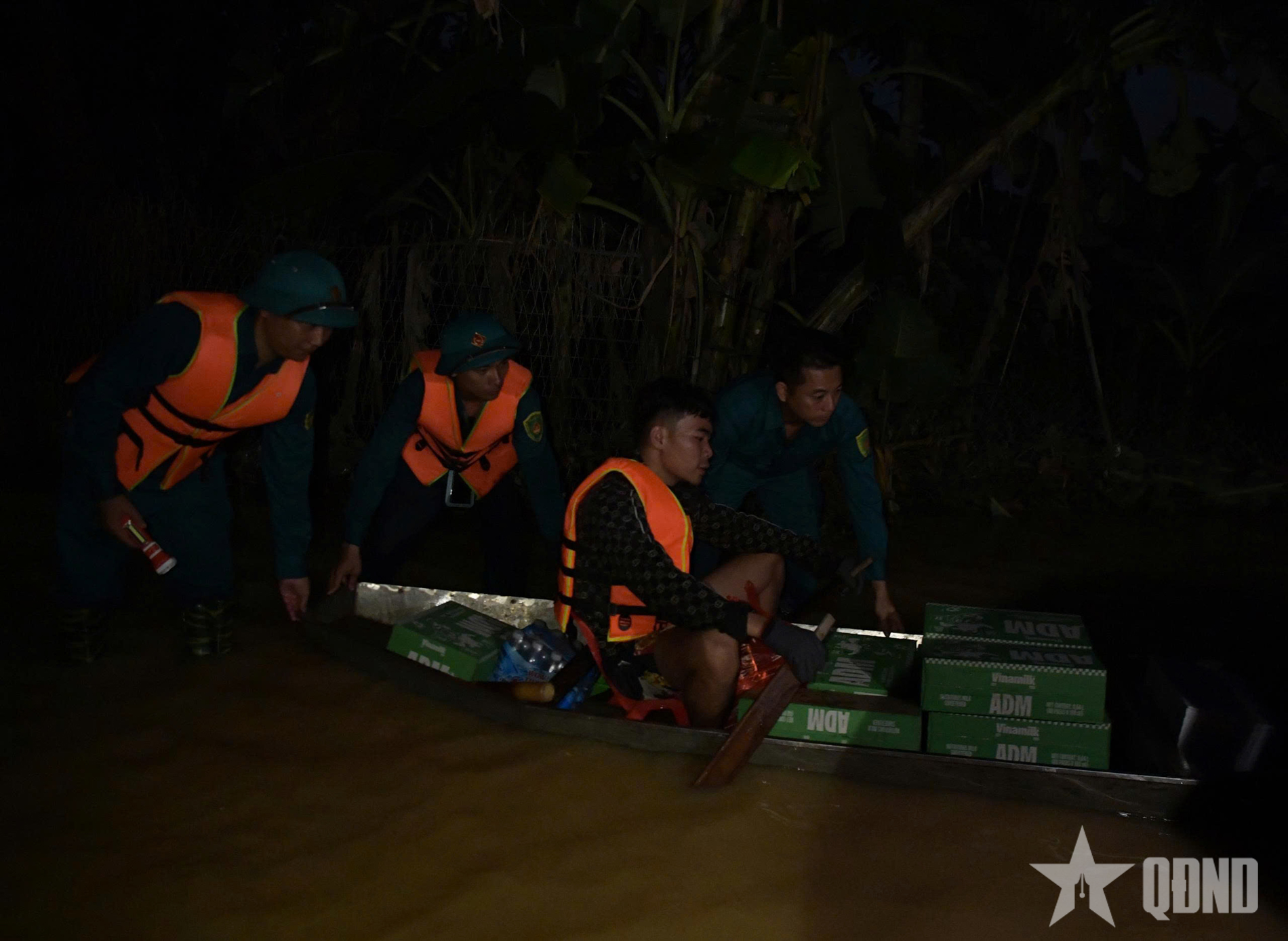 Đêm 8-10, Ban CHQS xã Hoàng Vân (Bộ CHQS tỉnh Bắc Ninh) vận chuyển lương thực, nước uống... cứu trợ nhân dân trong vùng ngập lụt.