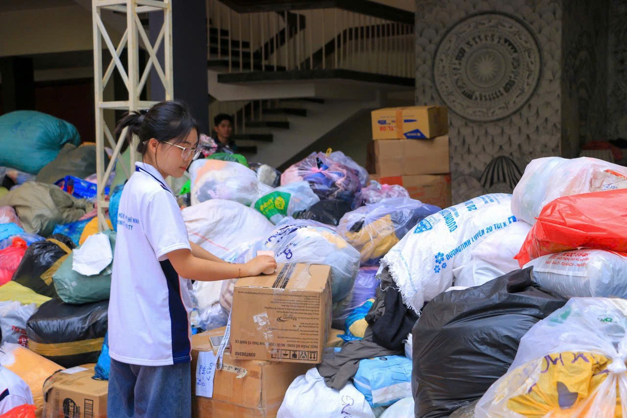 Hàng hóa nhiều, nhưng các bạn trẻ vẫn miệt mài đóng gói, phân loại để kịp chuyển đến tay đồng bào miền Trung đang cần.