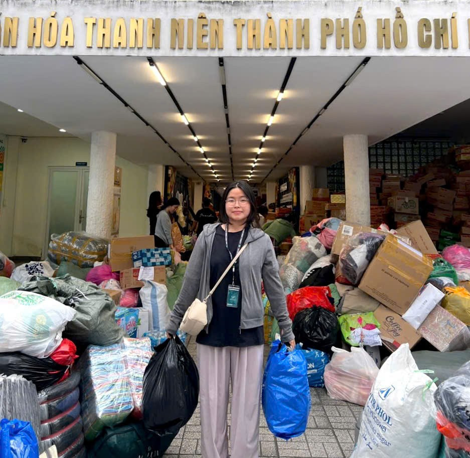 Lê Lâm Ngọc Ánh (trường ĐH Y khoa Phạm Ngọc Thạch) đến ủng hộ quần áo, mền gối và một số nhu yếu phẩm.