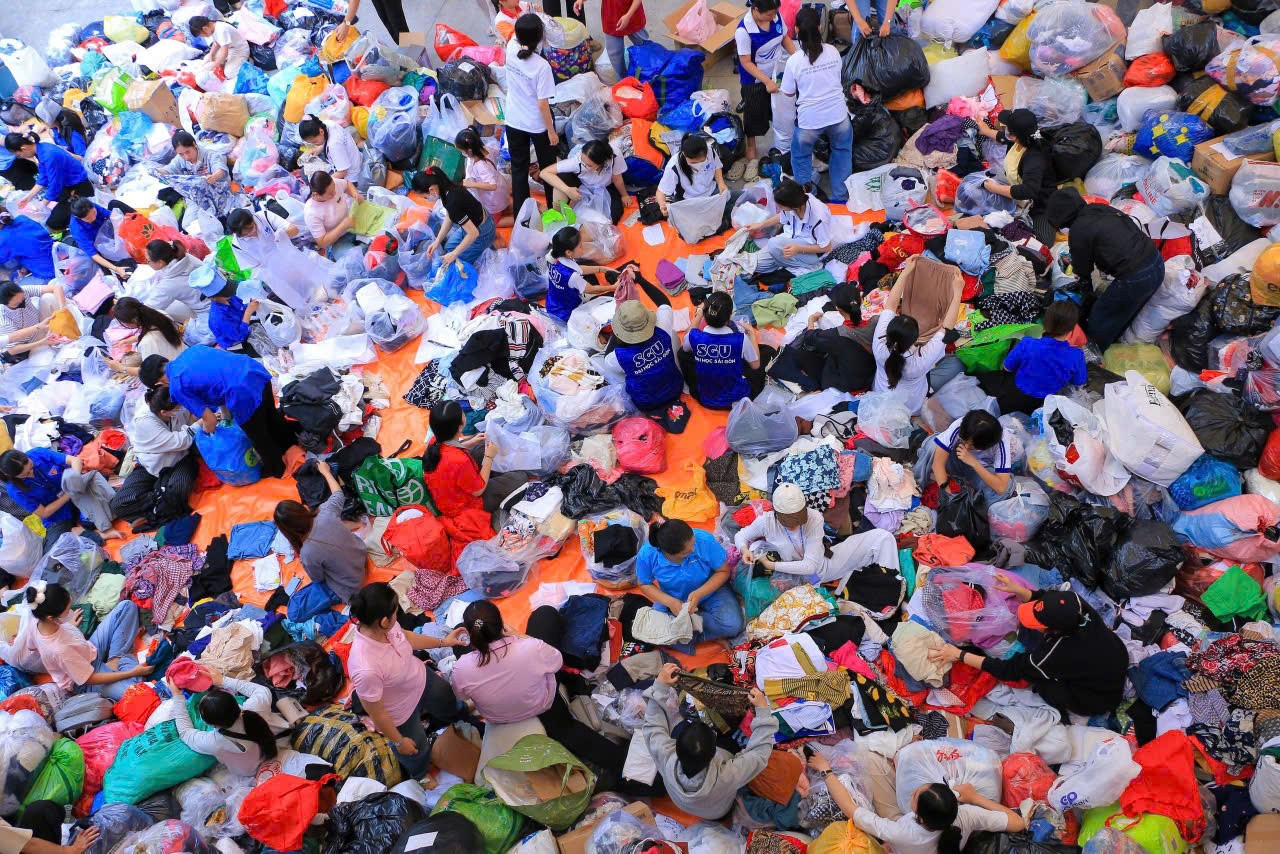 Từ sáng sớm, không khí làm việc tại khu vực tiếp nhận diễn ra liên tục. Các thùng mì, nước uống, quần áo, chăn màn và nhiều nhu yếu phẩm khác được người dân mang đến ủng hộ.
