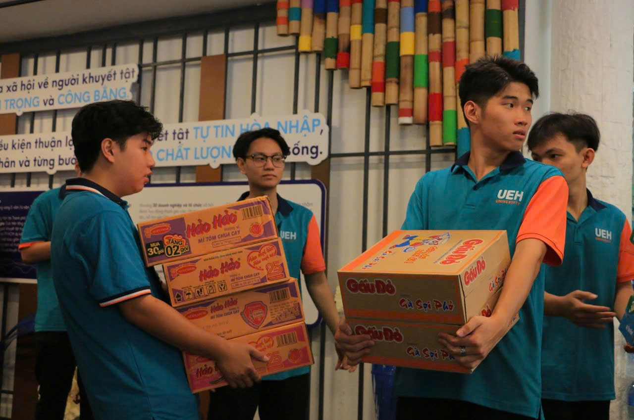 Nhóm sinh viên tình nguyện ĐH Kinh tế TP. HCM hỗ trợ vận chuyển hàng hóa vào điểm tập kết.