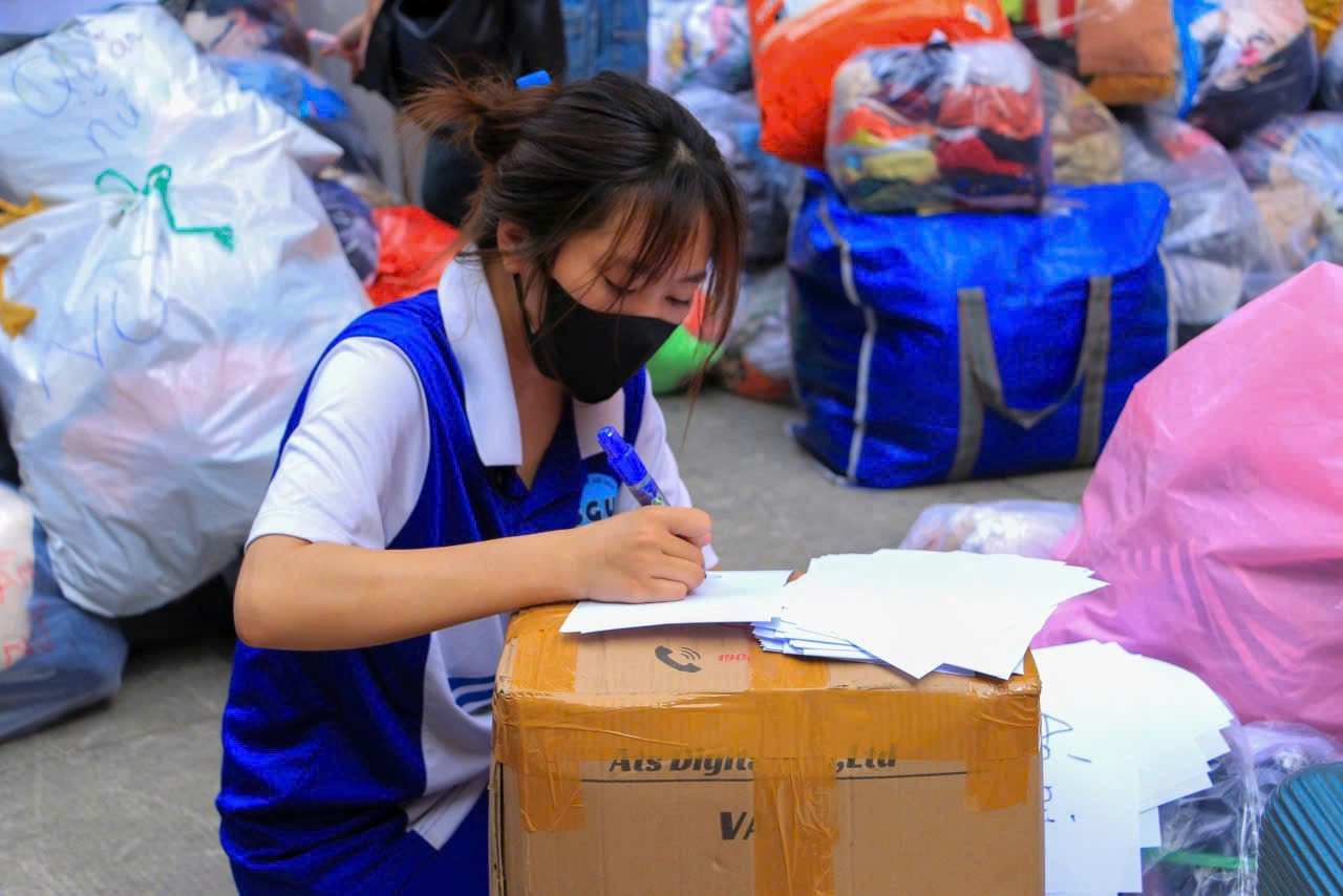 Lê Thị Vân Anh (trường ĐH Sài Gòn) đang phân loại quần áo.