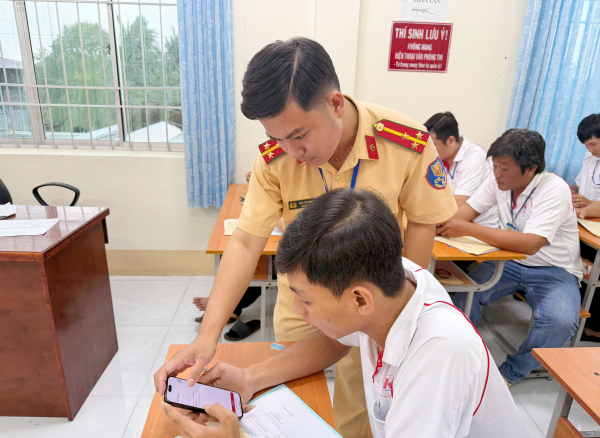Thượng úy Nguyễn Nhật Vi tận tình hướng dẫn công dân sử dụng ứng dụng VNeTraffic tại kỳ sát hạch cấp giấy phép lái xe.
