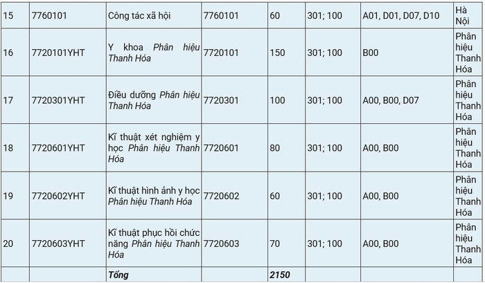 Về phân bổ chỉ tiêu, ngành Y khoa đào tạo tại Hà Nội chiếm số lượng lớn nhất với 450 chỉ tiêu. Y khoa Phân hiệu Thanh Hóa dự kiến tuyển 150 chỉ tiêu. Ngành Điều dưỡng Chương trình tiên tiến (đào tạo bằng tiếng Anh) tuyển 130 chỉ tiêu. Ở chiều ngược lại, Kỹ thuật phục hình răng là ngành có chỉ tiêu thấp nhất với 50 sinh viên.