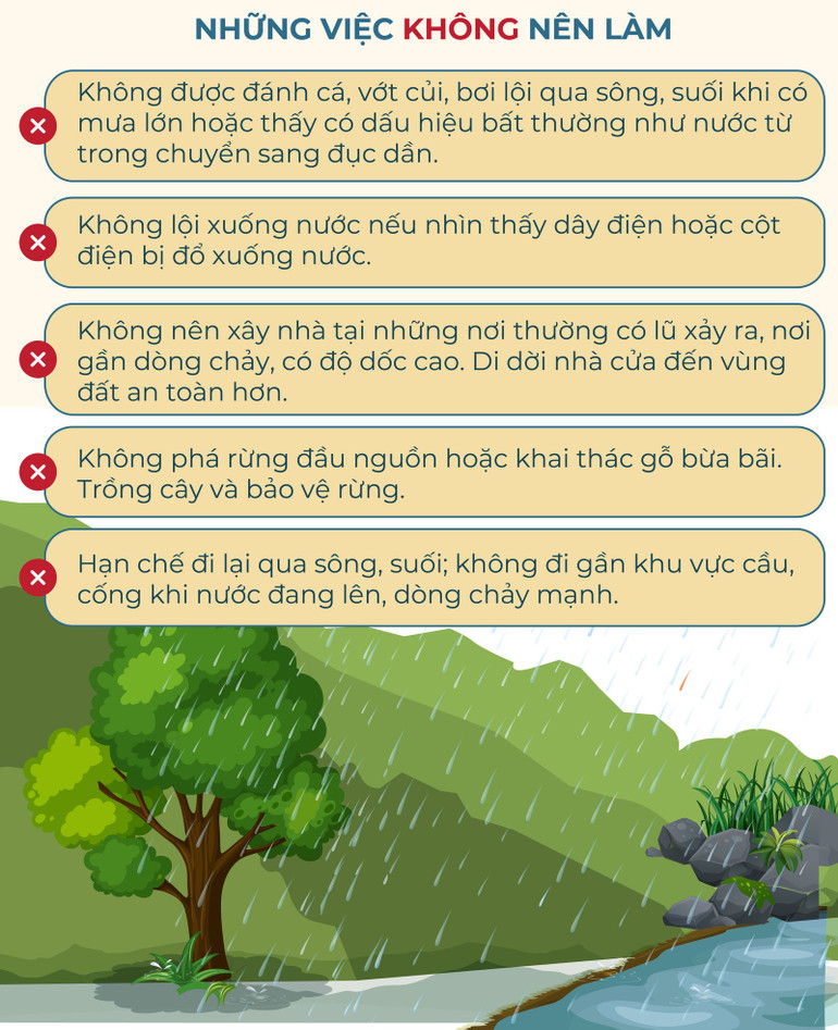 Tiếp đó, cần diễn tập các phương án bảo đảm an toàn khi có lũ lụt. Cụ thể như: Tìm một lối thoát hiểm an toàn mà mọi người trong nhà có thể sử dụng khi cần sơ tán khi lũ lụt xảy ra và diễn tập phương án thoát hiểm cùng gia đình. Các thành viên cùng trao đổi để thống nhất địa điểm gặp mặt trong trường hợp bị lạc nhau. Chuẩn bị “túi đồ dùng khẩn cấp”, bao gồm thực phẩm có thể bảo quản lâu dài, thuốc men, bộ sơ cứu, đèn pin, pin và nước đủ dùng trong nhiều ngày trong trường hợp bạn cần rời khỏi khu vực của mình hoặc khi các dịch vụ thiết yếu bị cắt. Hãy liên lạc với trường nơi con trẻ theo học để tìm hiểu về phương án ứng phó của trường khi có lũ lụt.