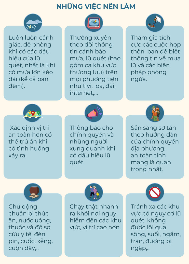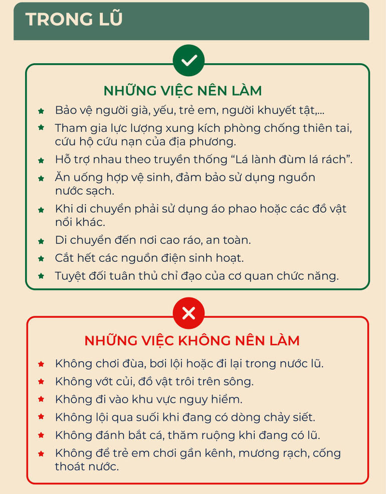 Thứ hai là giữ an toàn thực phẩm và nước uống. Cần đun sôi nước chưa qua xử lý ít nhất 3 phút trước khi dùng; chỉ sử dụng nước an toàn để nấu ăn và rửa đồ dùng; không ăn thực phẩm đã tiếp xúc với nước lũ.