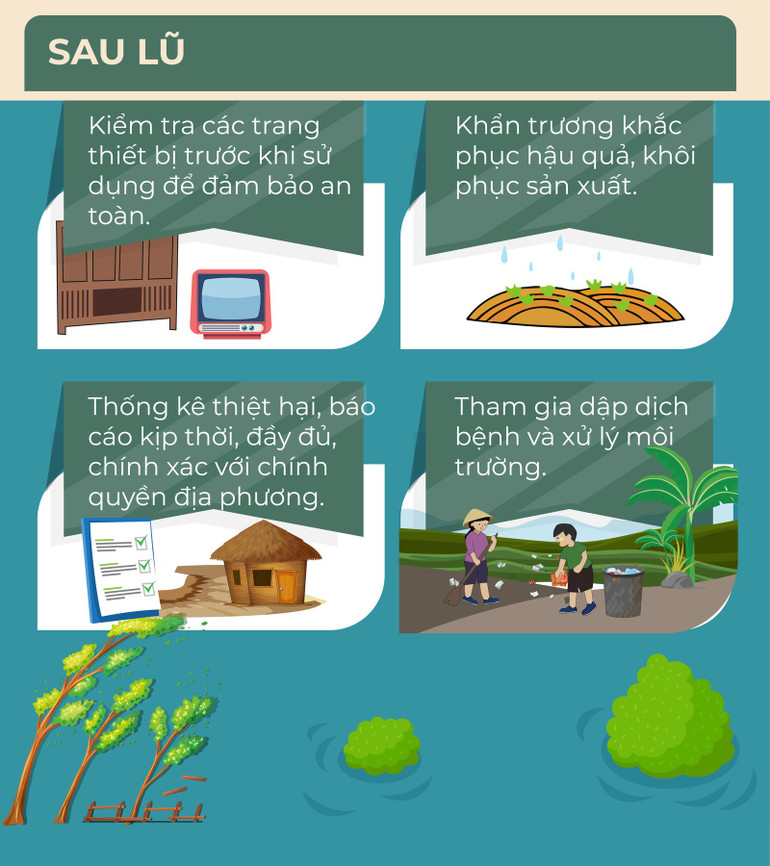 Thứ ba là vệ sinh, dọn dẹp an toàn. UNICEF khuyến cáo người dân cần mang găng tay, ủng khi dọn dẹp; chú ý vật cản và dây điện; làm khô, thông thoáng nhà cửa sớm nhất có thể; khử trùng đồ chơi, quần áo của trẻ; vứt bỏ những đồ vật không thể làm sạch.