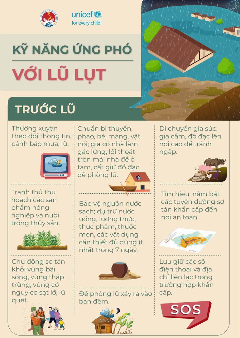 UNICEF Việt Nam cũng nêu bật một số hướng dẫn an toàn an toàn trước lũ lụt dành cho cha mẹ của trẻ em. Đây là những thông tin người lớn cần biết để ứng phó trước, trong, và sau khi lũ lụt xảy ra.