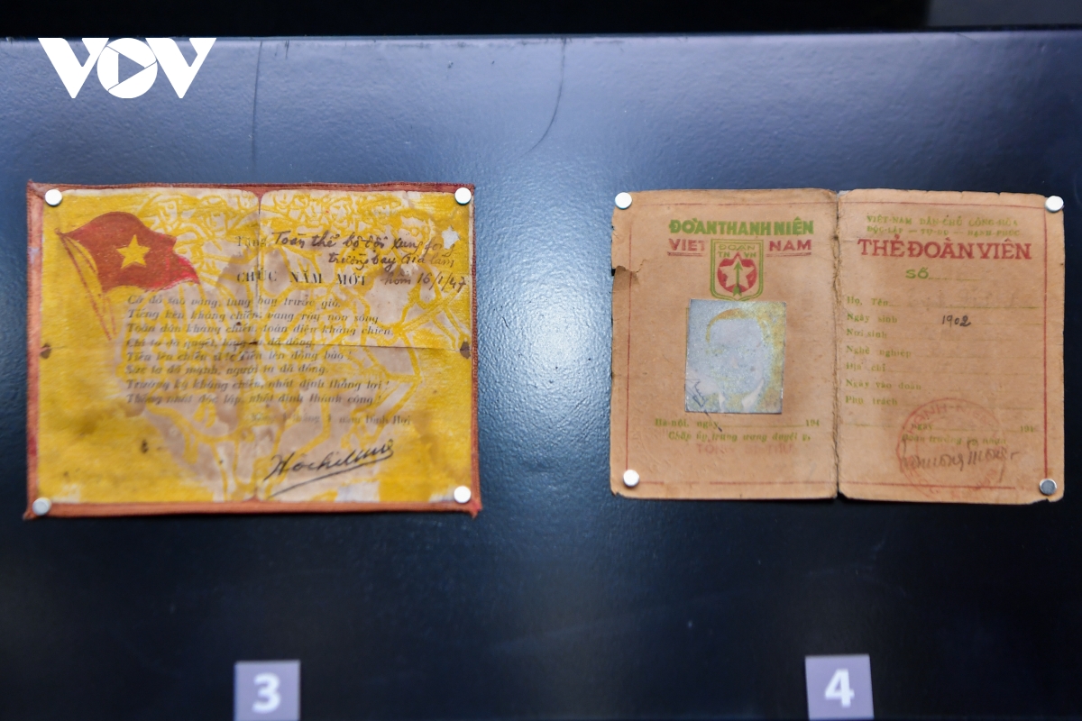 Trong thời điểm gian khó đầu năm 1947, tấm thiệp chúc mừng năm mới với bài thơ của Bác Hồ (bên trái) là nguồn động viên tinh thần lớn lao cho các chiến sĩ. Bên cạnh tấm thiệp Bác Hồ tặng bộ đội xung phong đánh sân bay Gia Lâm là Thẻ Đoàn viên của đồng chí Trịnh Đình Báu - Đoàn trưởng thanh niên Liên khu 1 Hà Nội.