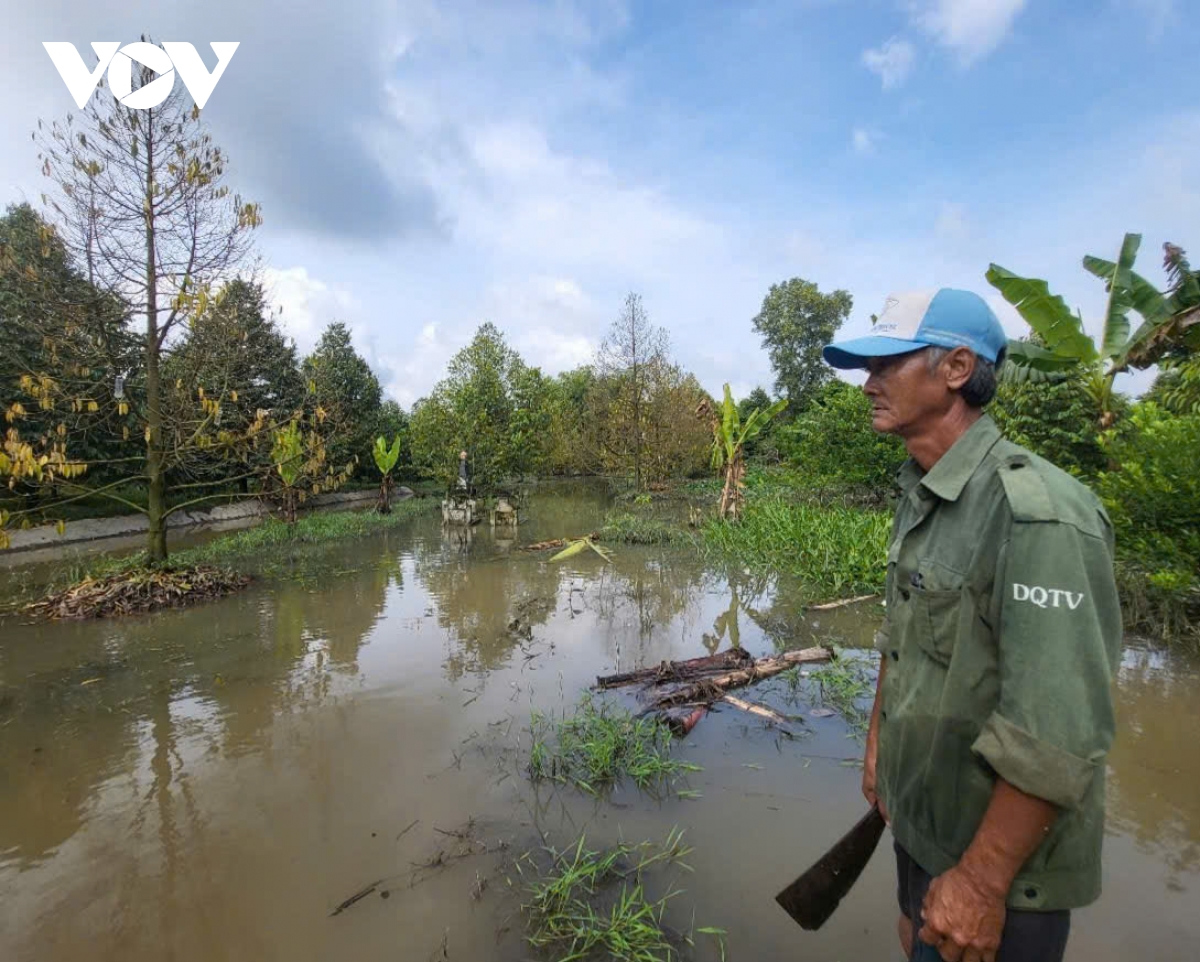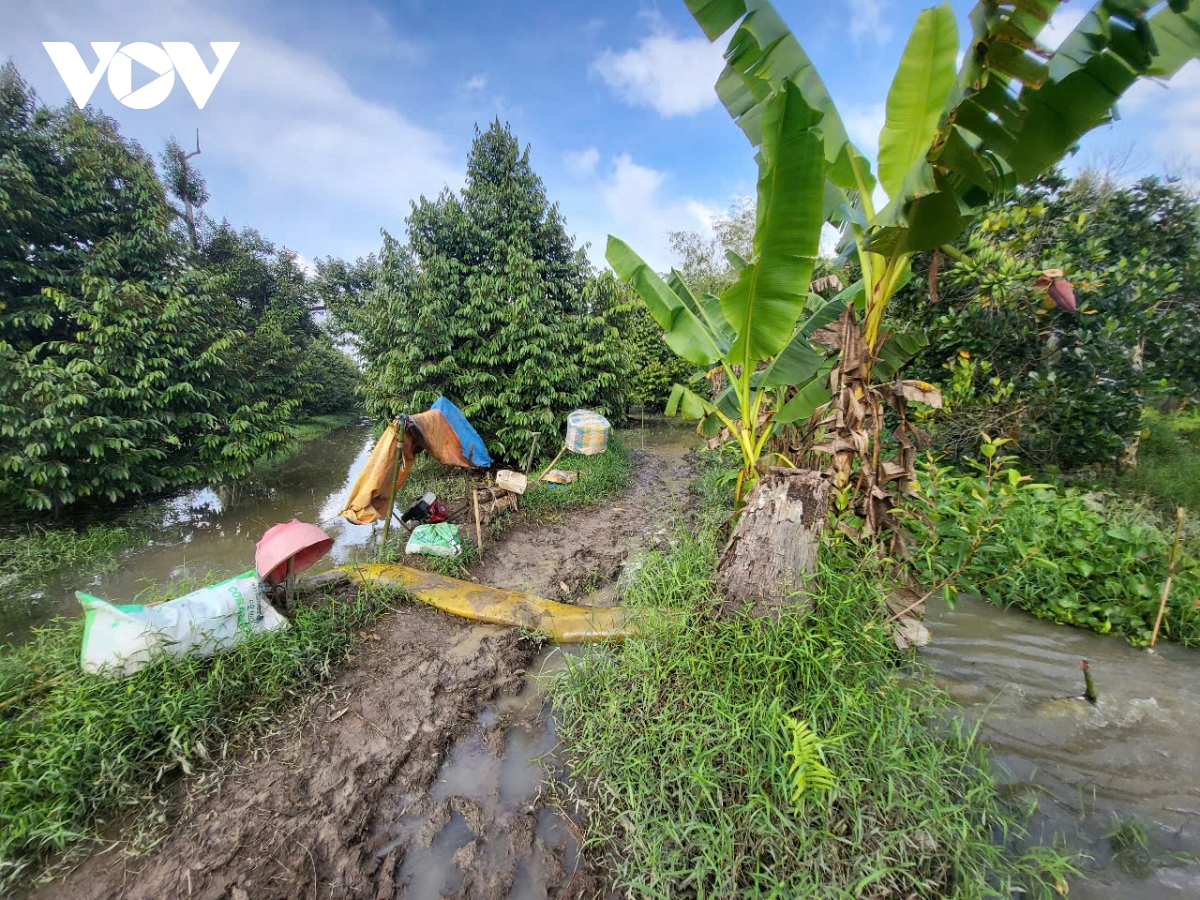 “Trồng sầu riêng không hà, chưa thu hoạch, năm nay tính để trái mà giờ tiêu hết rồi. Nước tràn từ dưới sông tràn lên, tràn qua lộ, nó lên chỗ cạn đó khoảng một tấc rưỡi, chỗ sâu đó khoảng 5-6 tấc. Nếu từ mô sầu riêng lên khoảng 3 tấc".
