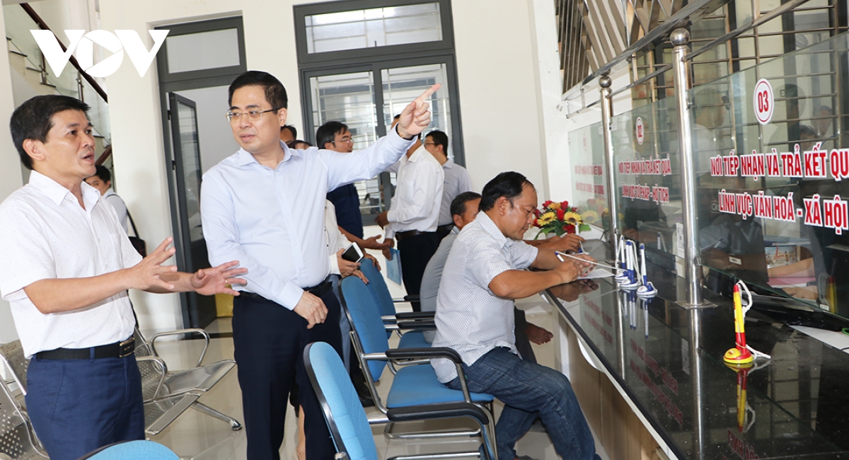 Ông Nguyễn Hoàng Giang, Chủ tịch UBND tỉnh Quảng Ngãi (người chỉ tay) kiểm tra việc vận hành mô hình chính quyền 2 cấp ở xã Vệ Giang