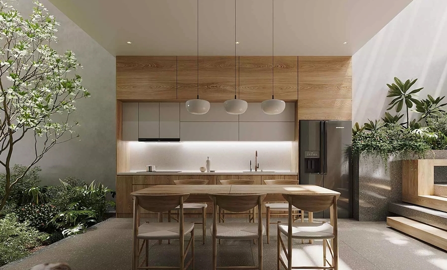 Năm 2026 cũng chứng kiến sự dịch chuyển mạnh mẽ sang các vật liệu bền vững. Gỗ tự nhiên được xử lý chống ẩm, đá nhân tạo cao cấp, kim loại tái chế hoặc bề mặt chống bám bẩn đang được ưu tiên sử dụng.