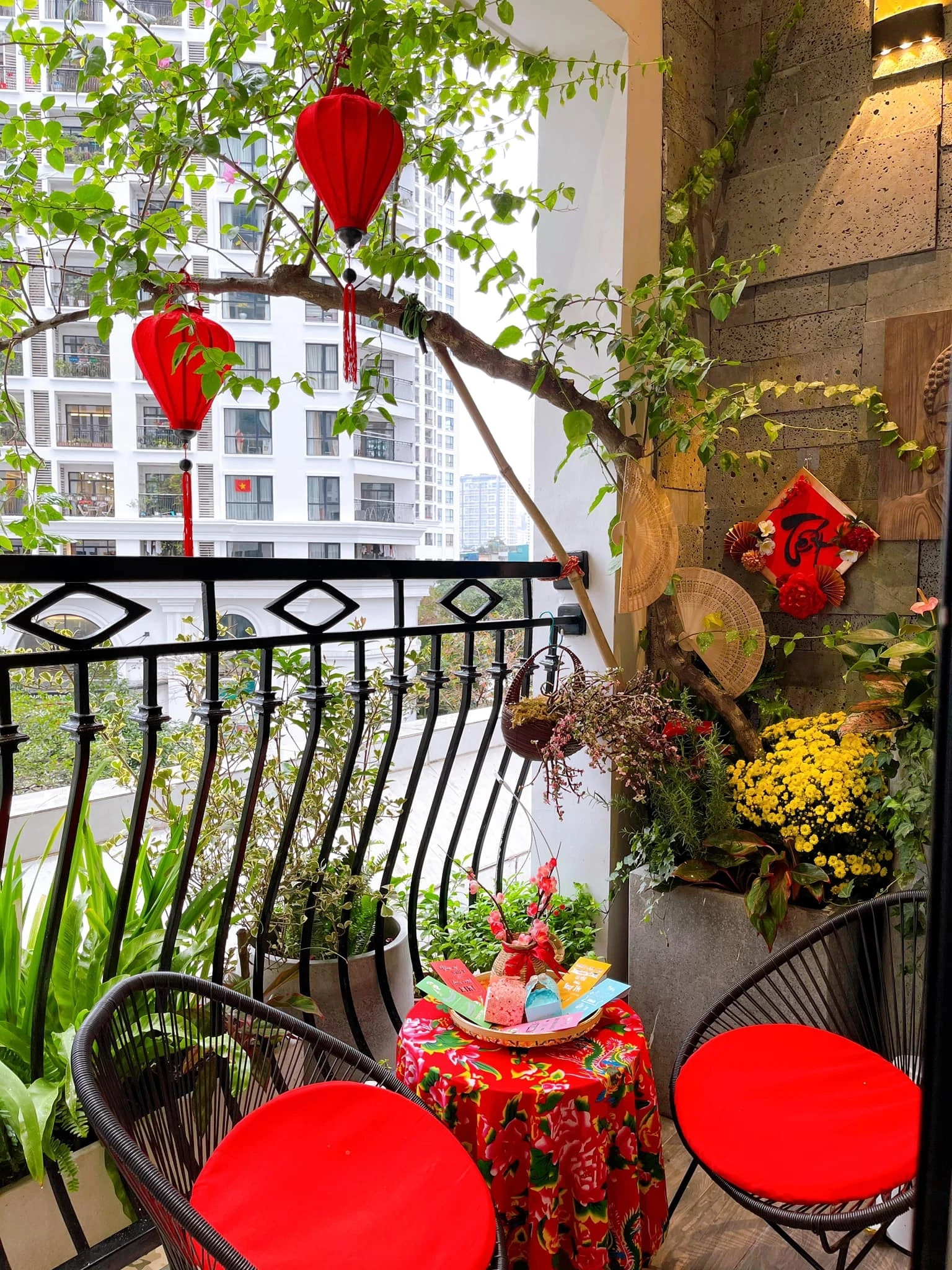 Dịp Tết, ban công có thể được biến thành một góc thư giãn lý tưởng để tận hưởng không khí xuân theo cách rất riêng. Chỉ cần một bộ bàn ghế nhỏ gọn, vài chiếc gối tựa mang gam màu đỏ, vàng ấm áp cùng chậu hoa mai, hoa cúc hay quất mini, ban công đã trở nên gần gũi và tràn đầy sắc Tết.