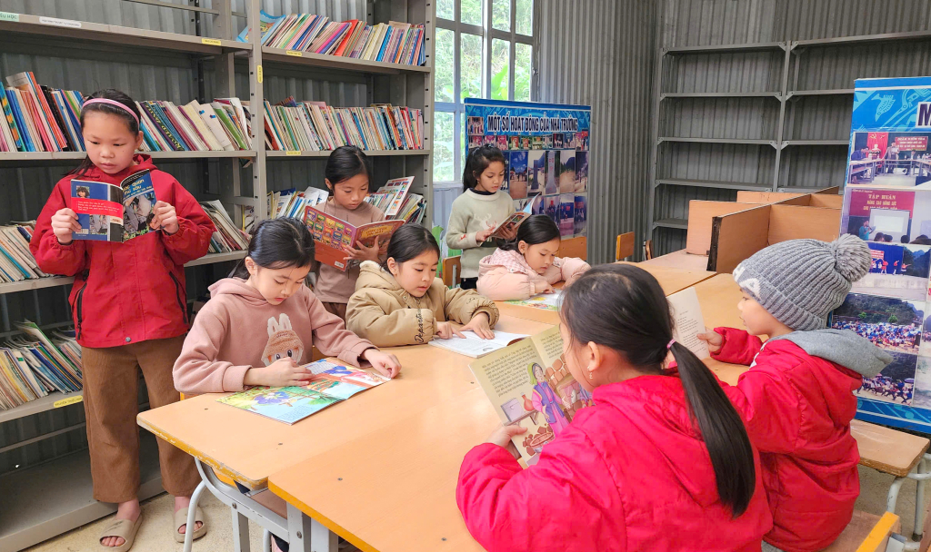Các em học sinh Trường Tiểu học và THCS Đức Long đọc sách trong phòng thư viện tạm thời của trường.